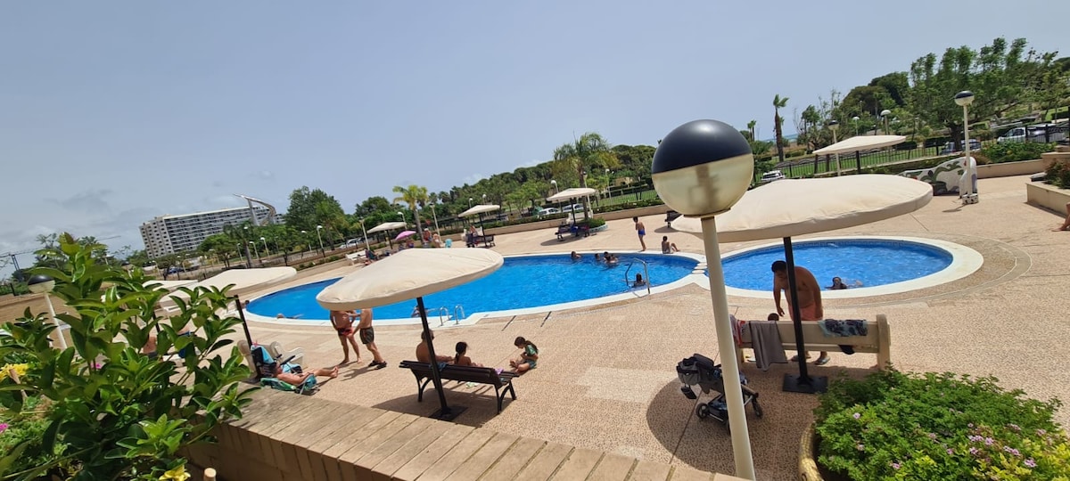 Apartment located on the first line of the beach. From the common area there is direct access to the beach. Kitchen equipped with kitchenware and washing machine, dining room, living room with ceiling fan and LED TV, terrace with views of the playground and the pool, 1 double room, 1 room with two beds, bathroom with bathtub, own covered parking space, doorman, playground, community pool.