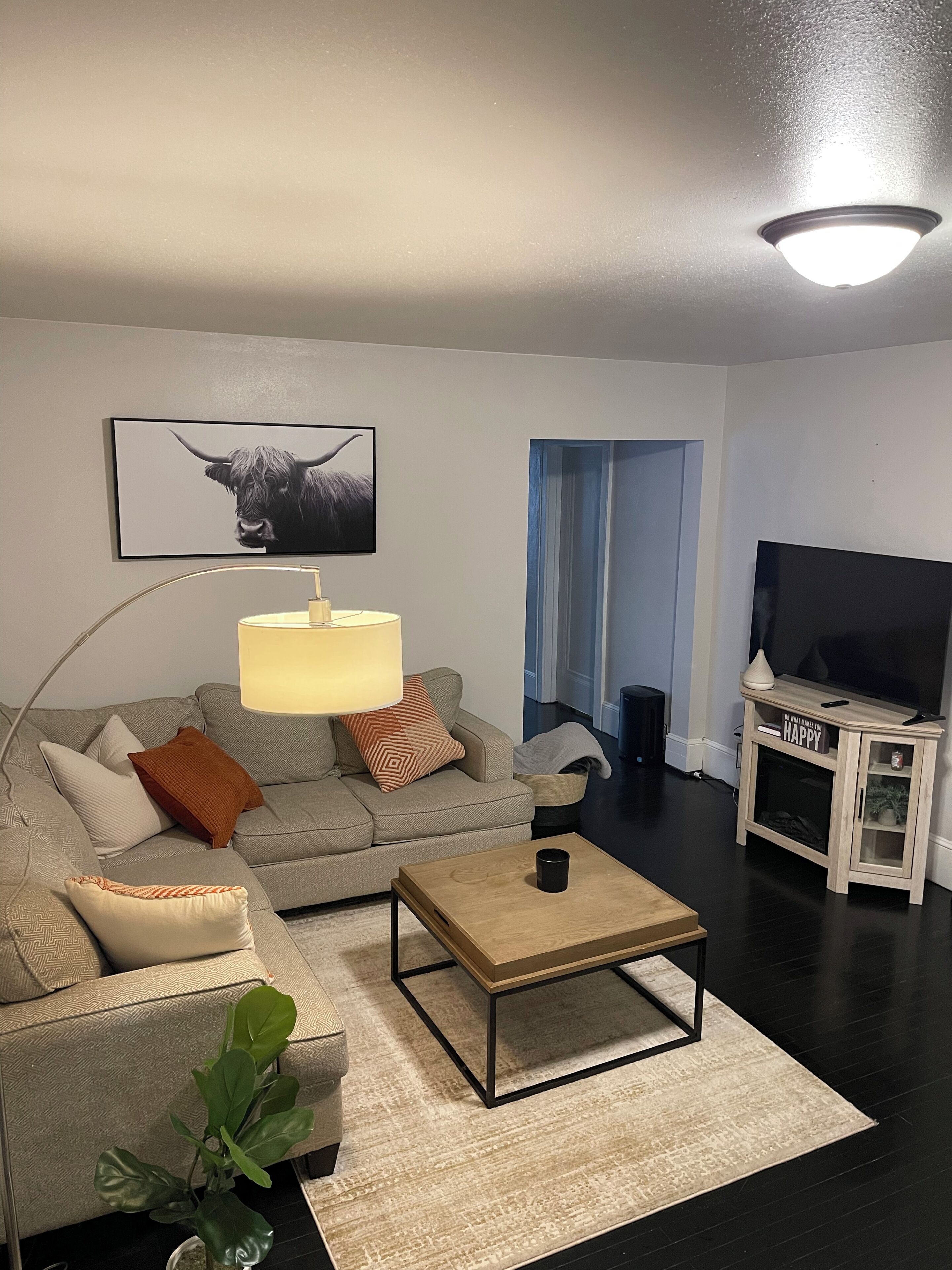 Both bedrooms have clean king size beds. One bedroom includes a chaise lounge chair with a large walk in closet. A stand up adjustable mirror is included in the master closet! There is lots of space for your clothes, as both closets have room for plenty of hangers and there is dressers in each bedroom. The living room has a soft couch and lounge chair, along with an LG TV equipped with cable TV, Netflix, Hulu, Disney+, Amazon Prime Video, and more. The laundry room is fully equipped with laundry detergent and bounce dryer sheets. The kitchen has 5 total seats for eating (island with three bar stools, and corner table with 2 bar stools). Coffee grinder, maker, and cups all included in kitchen. All dishes are included in kitchen (silverware, cutlery, plates, bowls, etc). There is a microwave and toaster oven along with a gas stove top and oven. The bathroom has a brand new deep tub.
