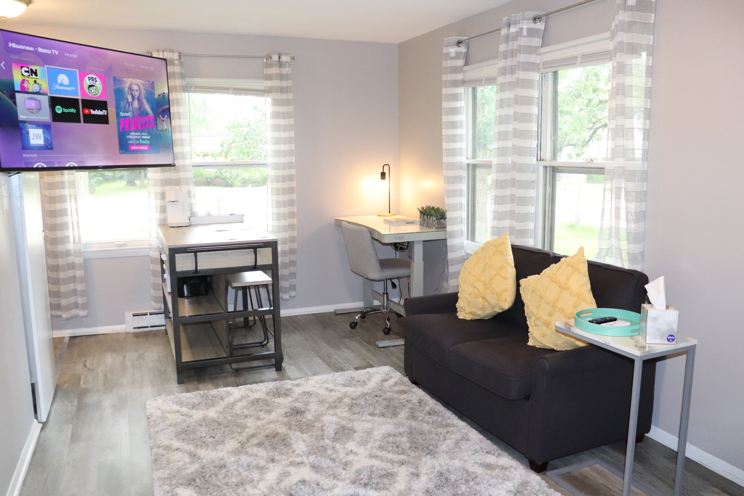 Welcome to your home away from home - a cozy and modern studio apartment perfect for solo travelers, couples, or small families. Relax and recharge in the comfortable queen size bed or turn the couch into a twin size bed for extra sleeping space. You'll never be without entertainment with a Smart TV and Roku, as well as fast and dedicated Wifi for all your streaming needs.