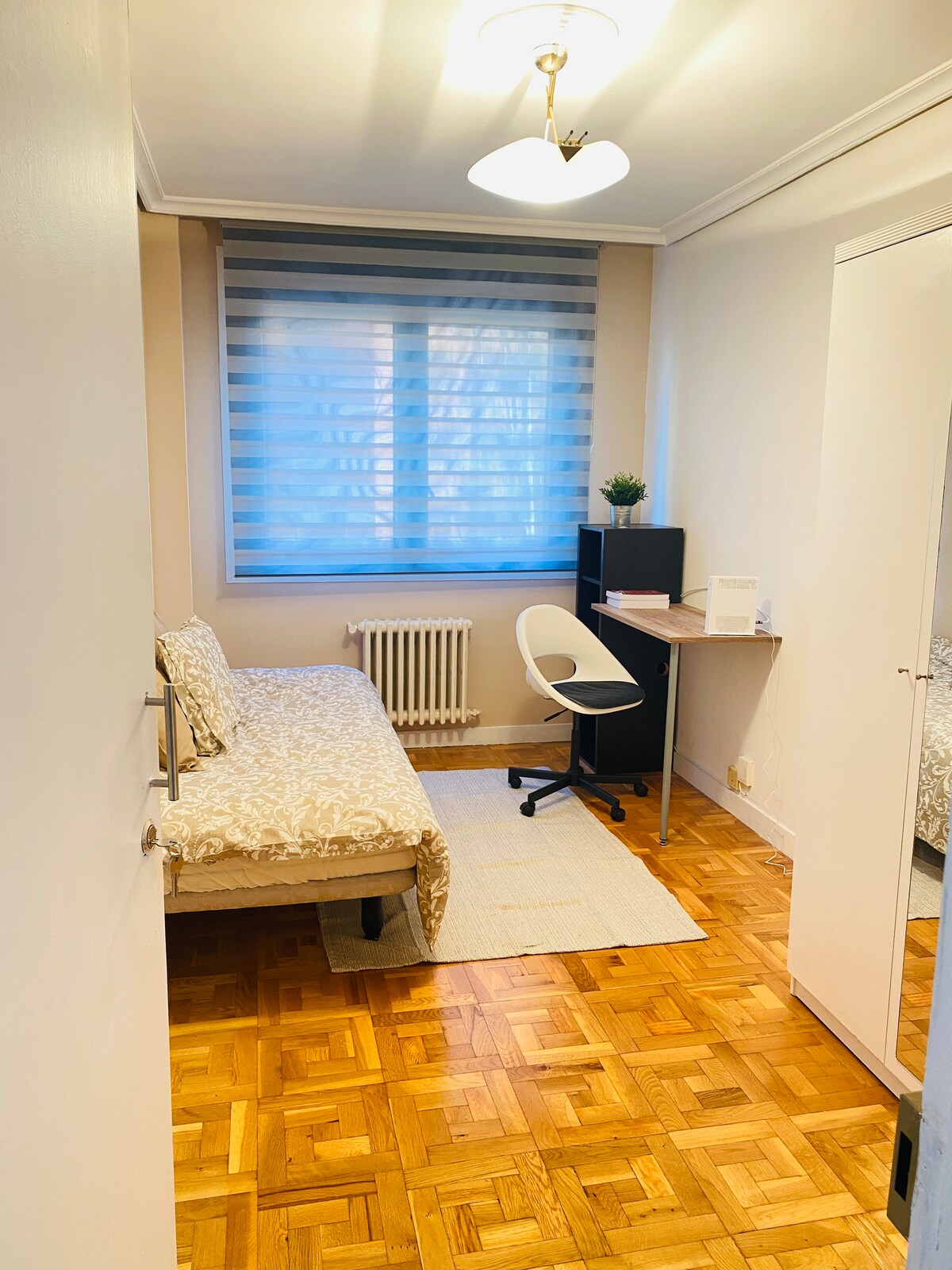Spacious and bright exterior room, Wi-Fi, large bed, sofa, desk, chair, closet, double-glazed window and shutter. Two full bathrooms always available, one exclusive for the guest, the other shared. Towels, gel, toilet paper, shampoo, and hairdryer. Free parking next door. Well connected, near the train station, next to a bus stop (day and night) in 10 minutes in downtown Pamplona. Next to bars, restaurants, banks, shops, and other services.