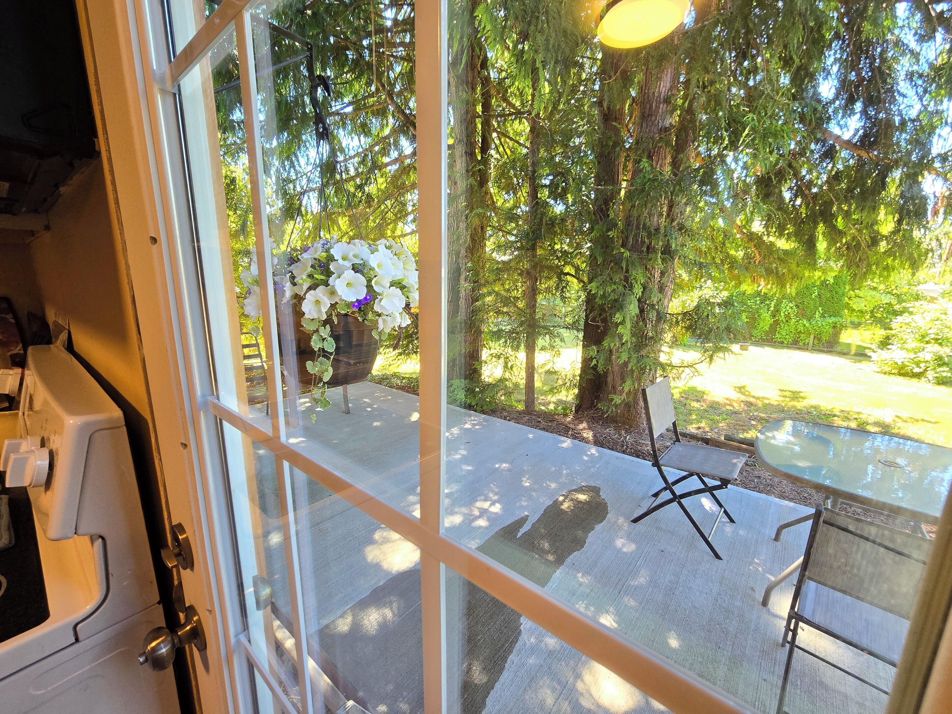 The backyard is a grass space shared with us. You'll have a private patio to lounge in. Our school-aged kids may be on the trampoline or playing in the yard. Please clean up after your pet.