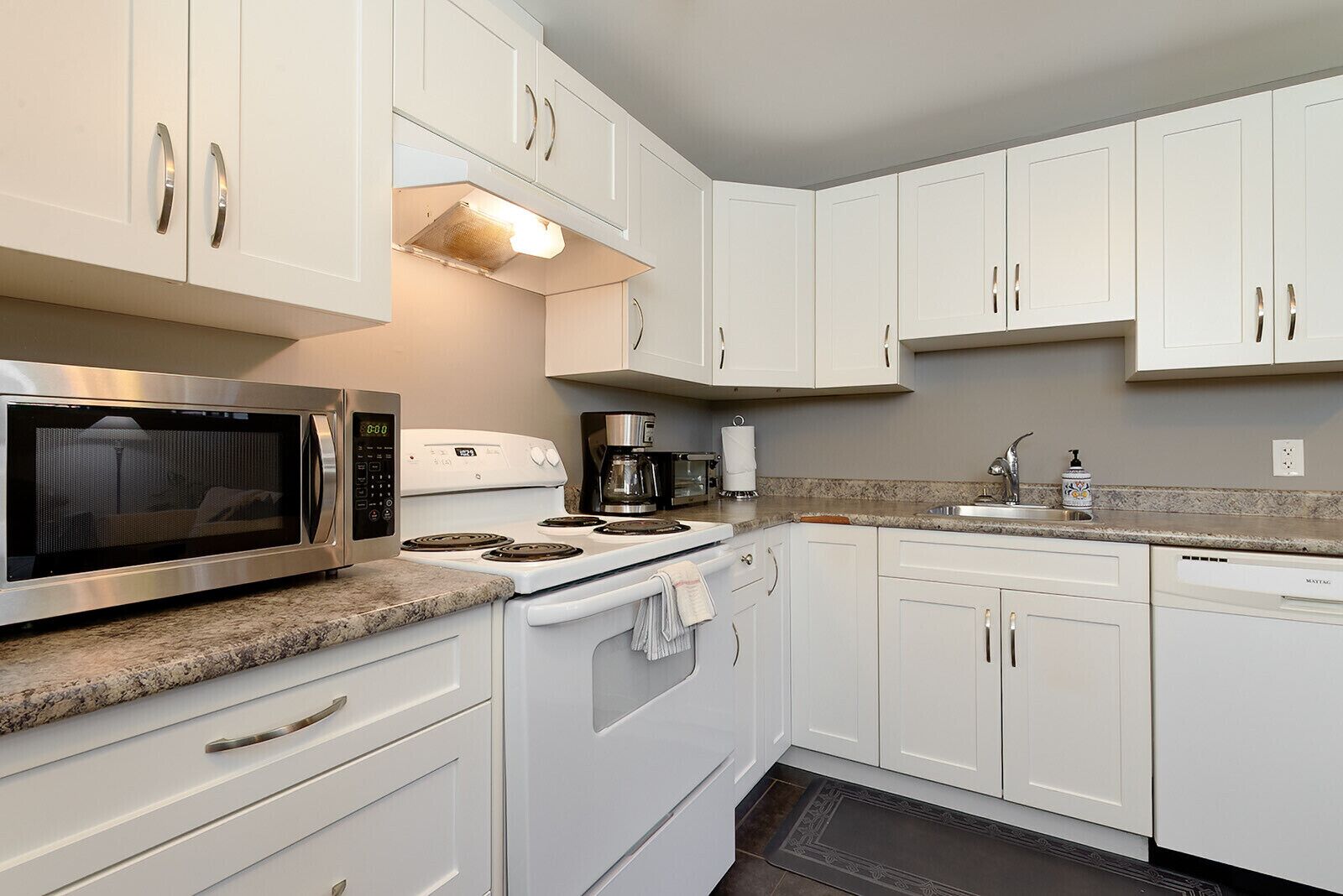 Gourmet kitchen: It has been updated to white quartz countertop on the perimeter and quartz backsplash for a refreshing white kitchen look! In contrast, the kitchen's island is in beautiful black granite giving the entire kitchen a modern yet coastal feel. Stainless Steel appliances and with everything you could possibly need from coffee maker, toaster, waffle maker, blender,. Fridge, gas range, microwave and dishwasher for your convenience.