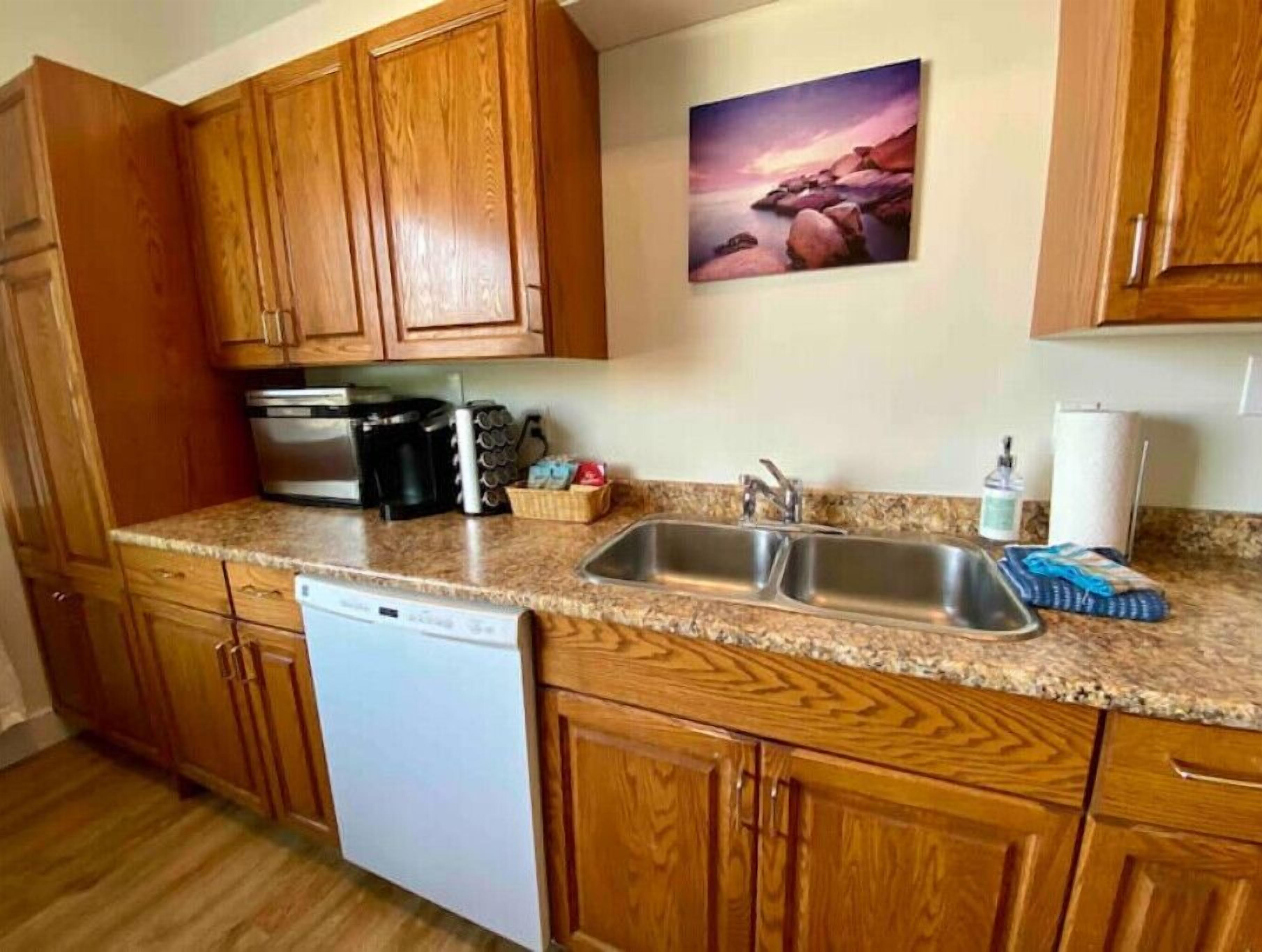 You get a full size kitchen with fridge, stove, dishwasher, microwave and all the appliances and dishes you need for preparing, cooking, and serving your favorite foods to your family. There is a spacious dining area in the kitchen that seats four.
