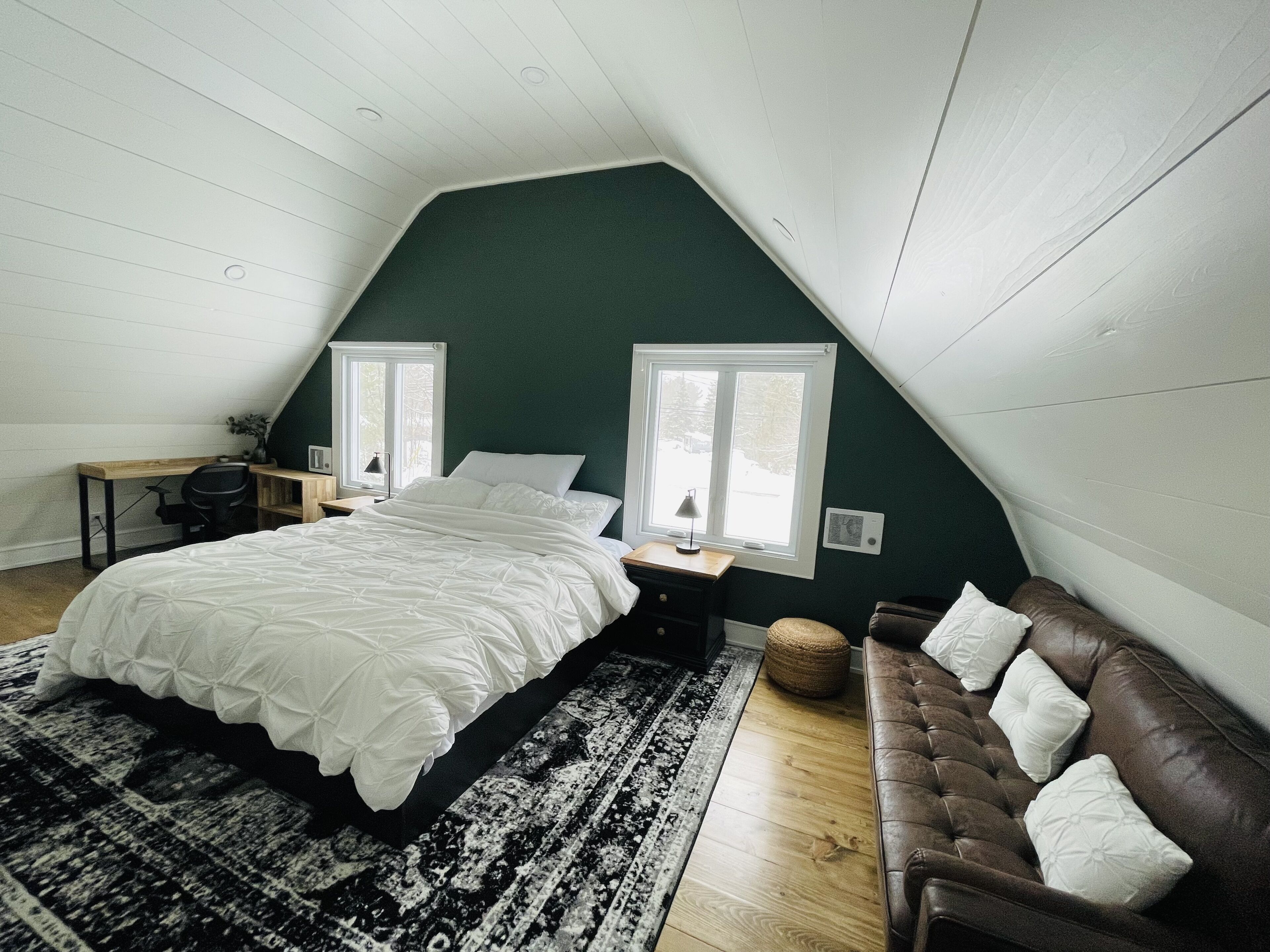 It is air conditioned, as well as two oscillating fans provided, if needed. A separate closet with hanging space is off the loft. There is a privacy door that separates the upstairs from downstairs. The stairs to the loft are a bit steep-part if that era’s charm and the older homes from Parry Sound. Please be advised, likely not suitable for someone with mobility issues.