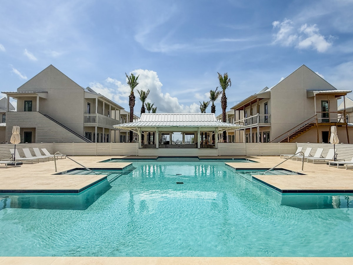 Two full bathrooms, two bedrooms, large open living area, full kitchen, full laundry room with washer & dryer, and a large outdoor patio overlooking the pool and beach.