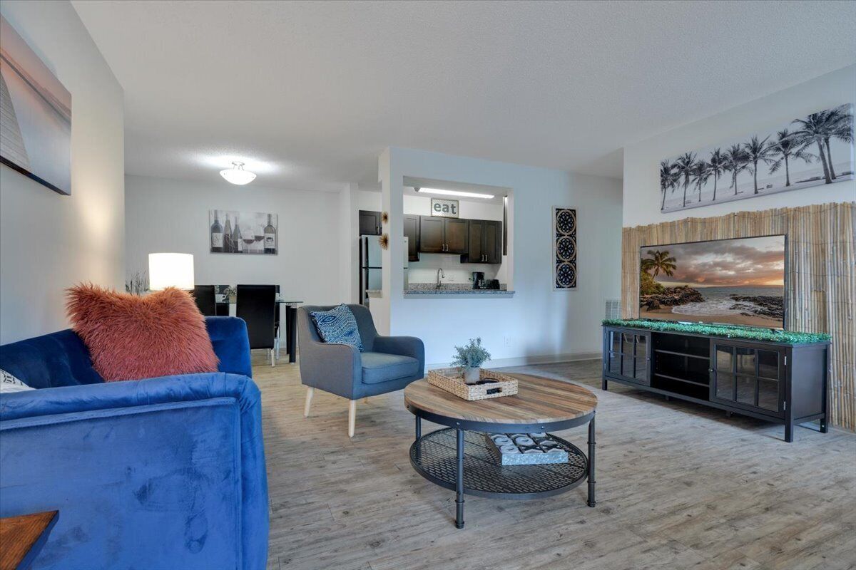 The living room features a faux leather sofa and coffee table and comfortable sitting chair. Enjoy your favorite show on the 43" Smart TV with Netflix, Amazon, and AppleTV streaming services.