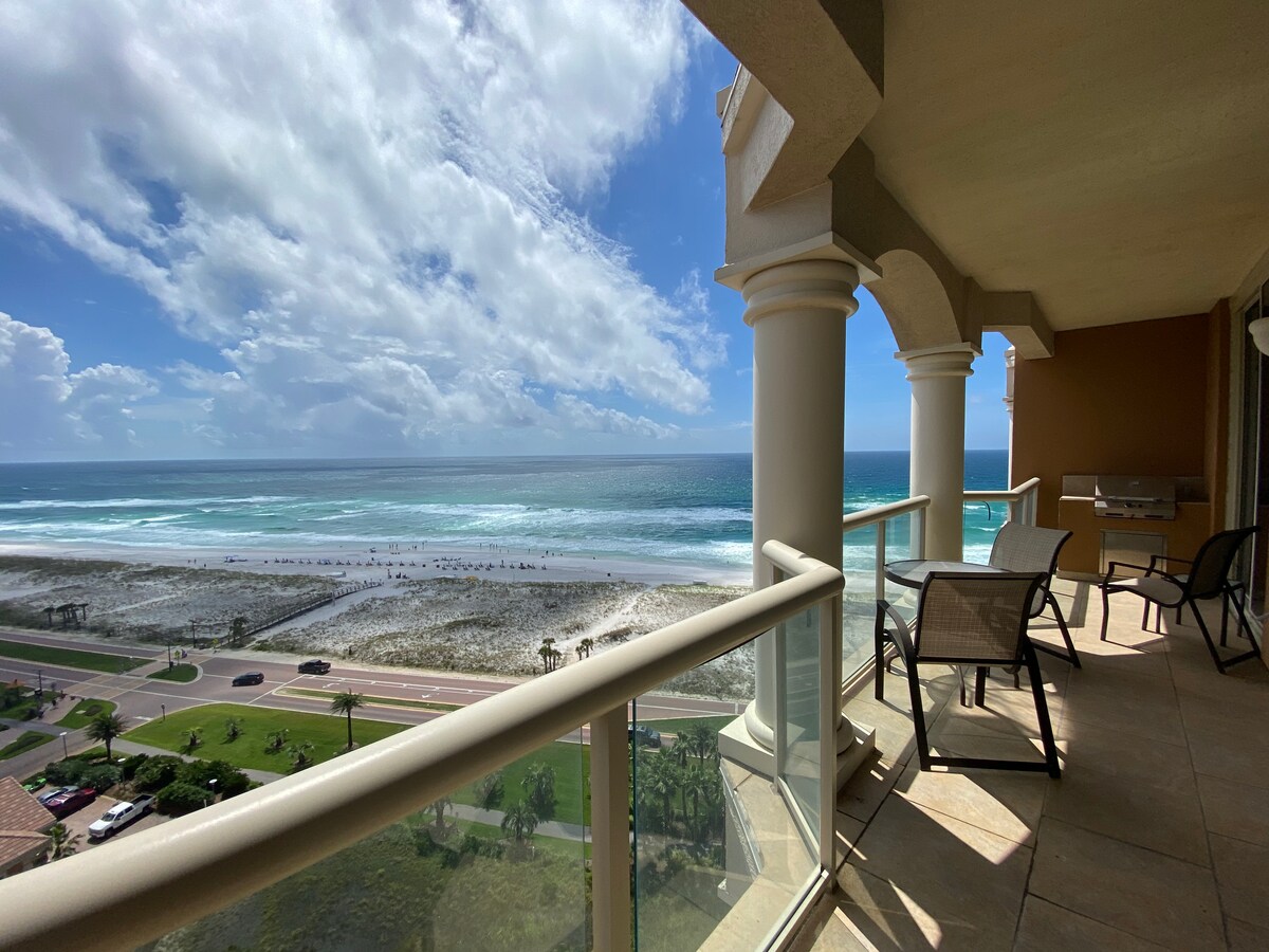Relax with the whole family at this peaceful place to stay with views of the Gulf Of Mexico. This 13th floor unit has a King bed in the master suite, Queen bed in the spare suite, and a full sized pull out sofa bed accommodating 6 people in total. Each bedroom and living room has a view of the water!