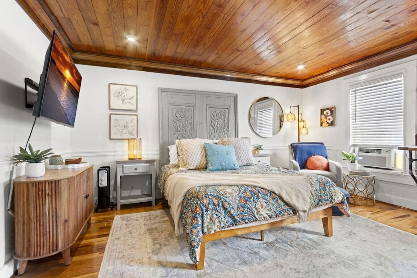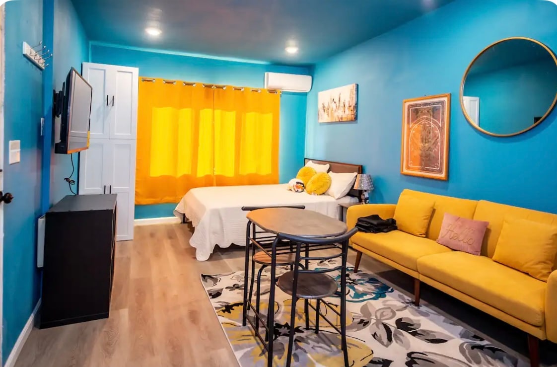 This is a spacious, bohemian inspired, 2 bedroom 2 bath, with 2 king beds, on the bottom floor of a duplex. Two roll away beds makes it a 6 sleeper.