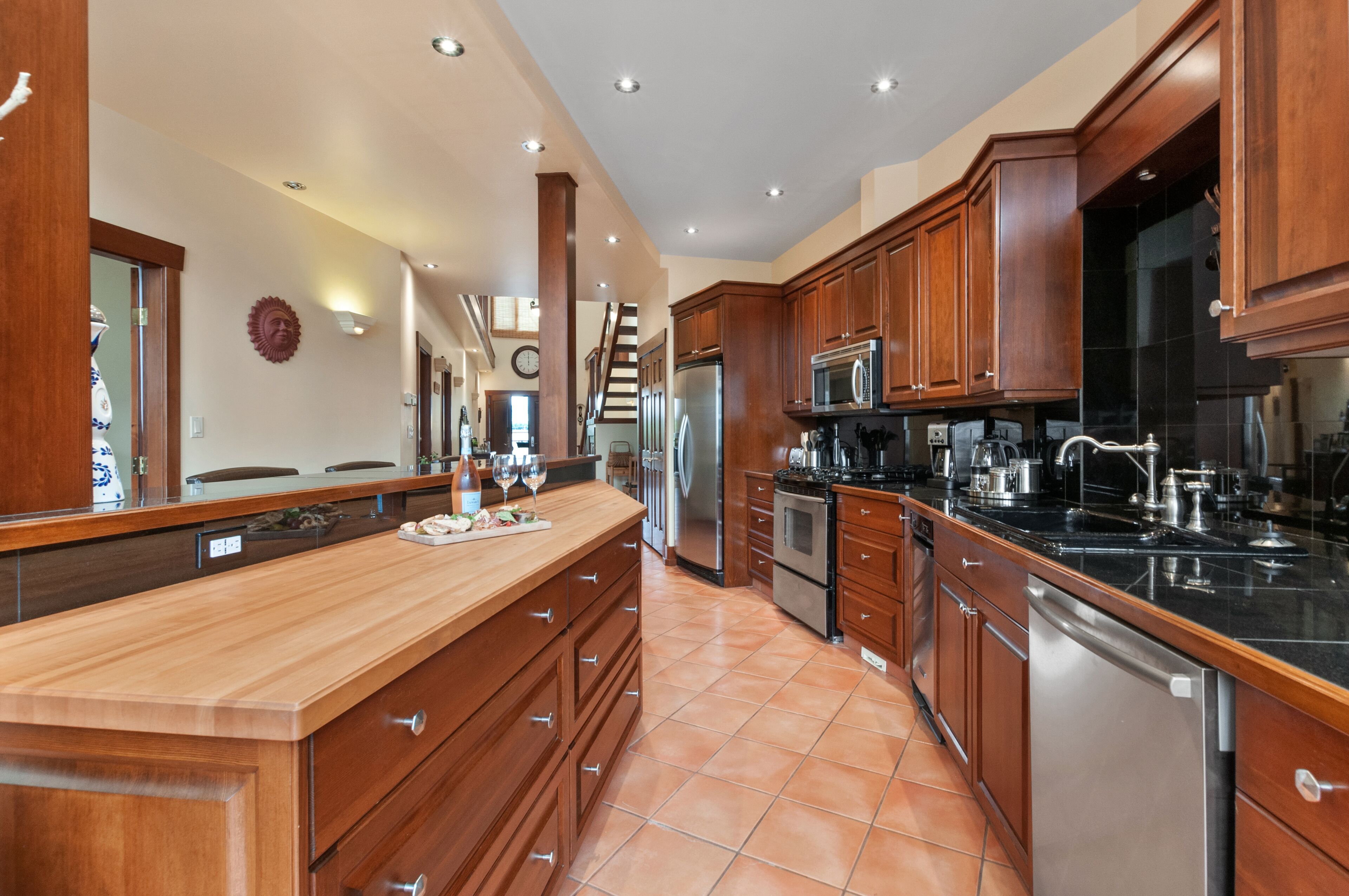 -Fully equipped kitchen has all the comforts of home and comes stocked with coffee, tea and spices.