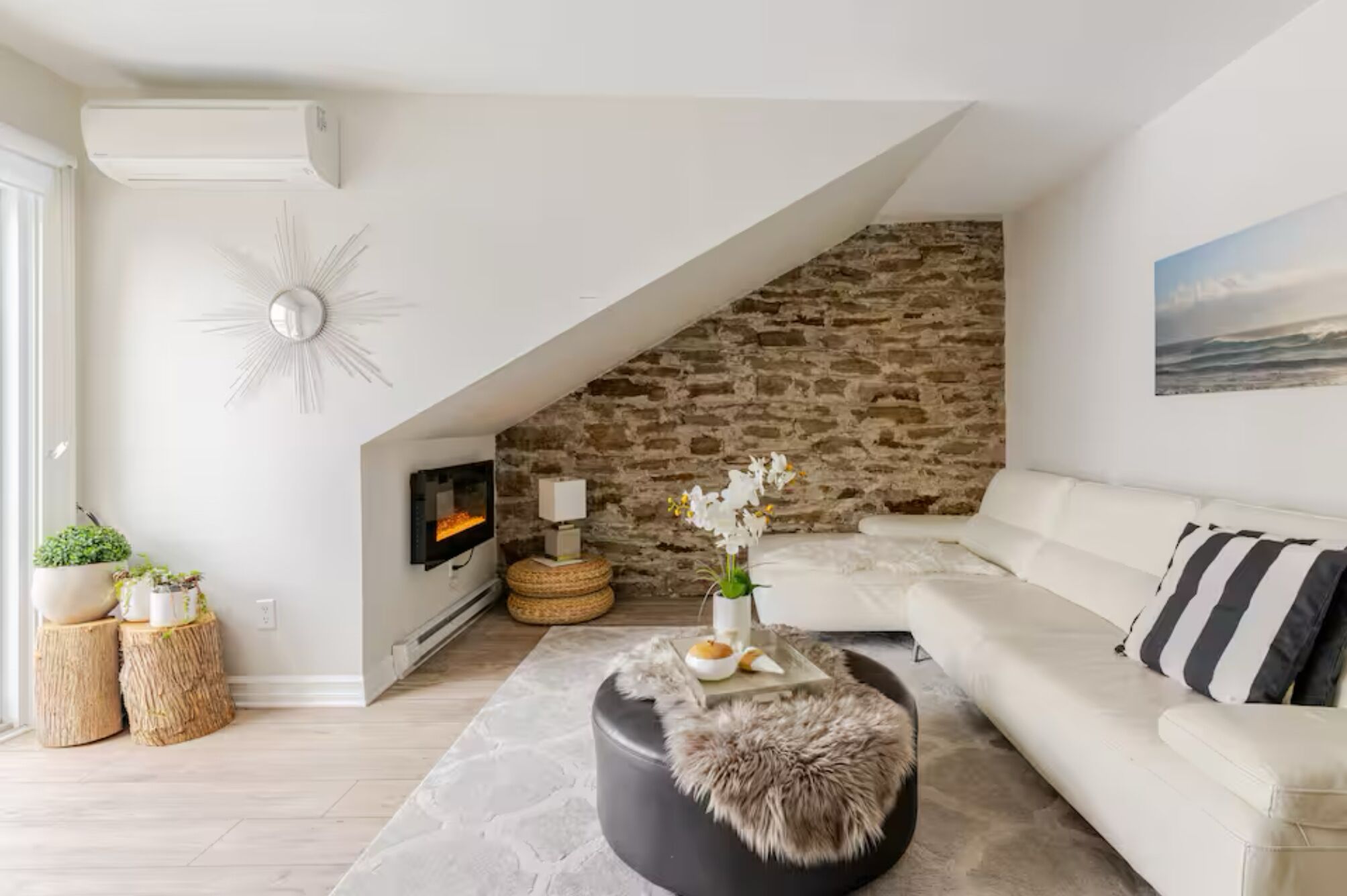 •Bright, open-concept living area with a leather couch, smart TV, and electric fireplace