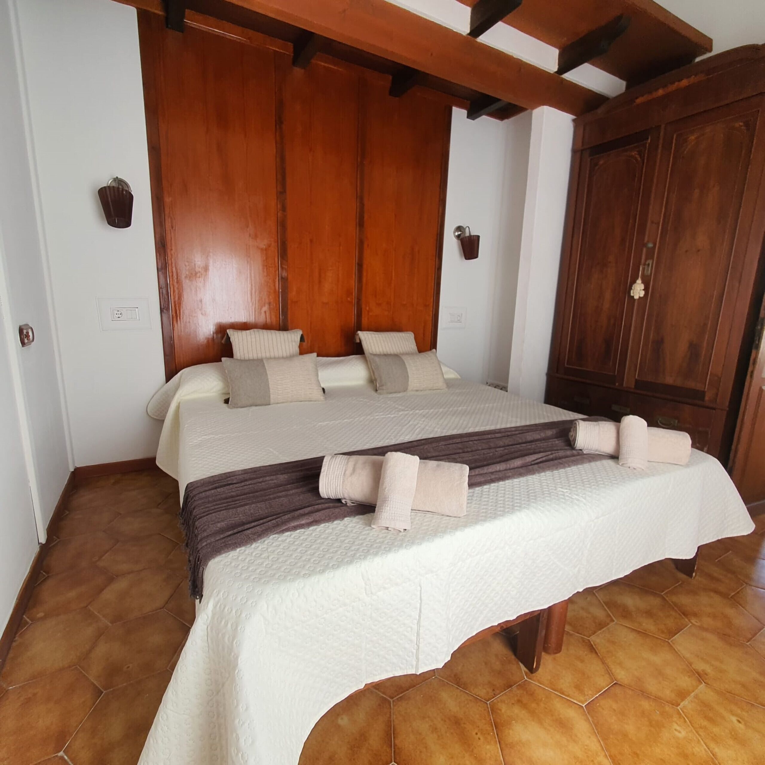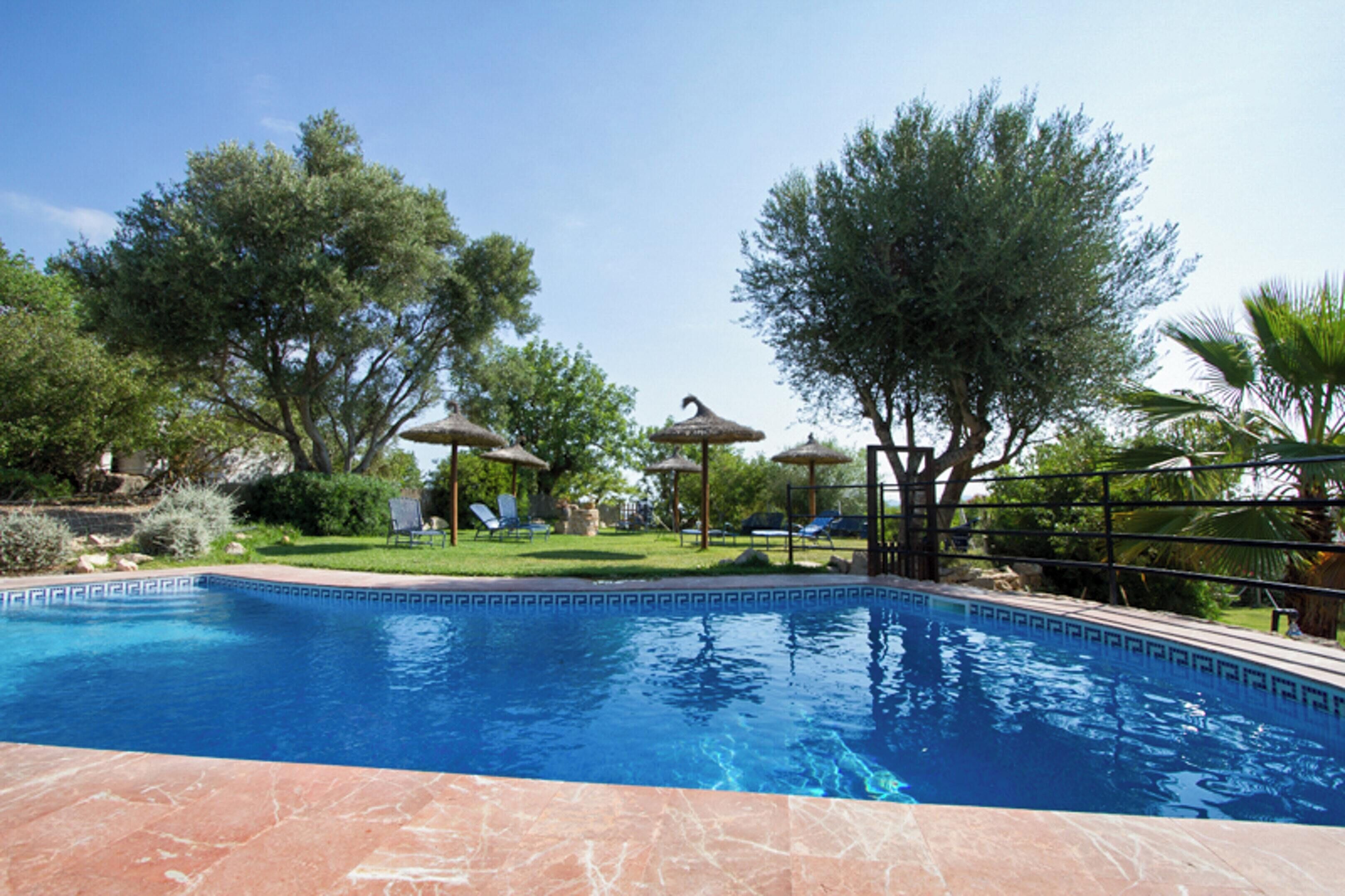 Escape to a tranquil haven in eastern Mallorca, where this elegant villa is set amid a lush landscape of ancient trees, offering privacy and comfort for up to ten guests. Designed with modern convenience and traditional charm, the home features five beautifully appointed bedrooms, each with a double bed, air conditioning, and a private en-suite bathroom. One bedroom is conveniently located on the ground floor, while the remaining four are upstairs, ensuring space and privacy for all guests. Inside, the villa blends style and functionality with tasteful interiors, including exposed beam ceilings, marble floors, and light, airy walls. Spacious living areas provide the perfect setting to relax or entertain, with a cozy living room equipped with a flat-screen satellite TV and DVD player, and a large dining table for shared meals. The fully equipped kitchen features modern appliances, including a ceramic hob, oven, microwave, dishwasher, large refrigerator, and electric kettle, making it easy to prepare home-cooked meals. Step outside to discover a true Mediterranean retreat. Lounge on the pool terrace with ten sunbeds and parasols, take a refreshing dip in the 11-meter pool, or enjoy breakfast in the covered terrace area. Evenings can be spent savoring meals prepared on the barbecue while soaking in the serene surroundings. The villa is just a short drive from the charming town of Petra, with local restaurants, supermarkets, and the famous Sineu weekly market. For beach lovers, Can Picafort and the Bay of Alcudia are nearby, while cycling enthusiasts will appreciate the scenic routes and secure bike storage. Tourist Tax:- A mandatory tourist tax (Ecotasa) applies in the Balearic Islands, payable in cash on arrival. Guests under 16 are exempted. The tax ranges from €0.55 to €2.20 per person per night, depending on the season.