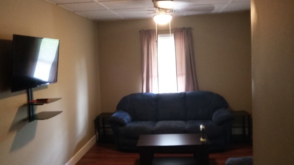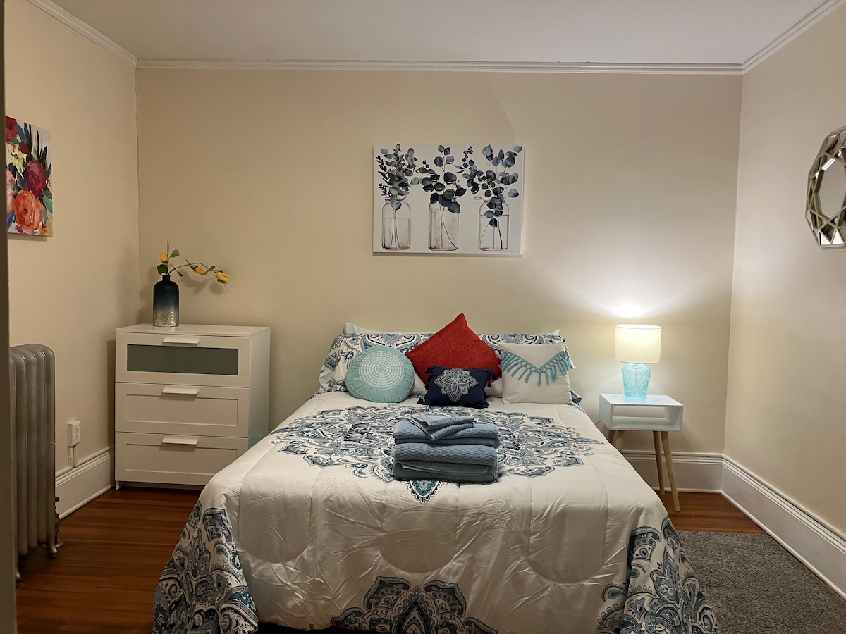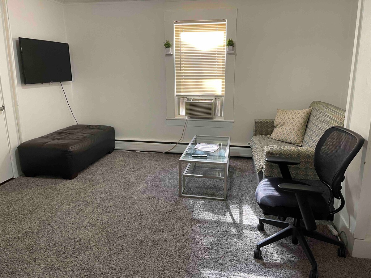 Relax by yourself or with a companion in this quiet triplex. This is a first floor apartment, full kitchen, full bath, living room and bedroom. Off street parking in the rear of the building with a separate rear entrance. Back deck, front porch, shared grill and outdoor table and chairs. Wifi, tv, queen bed, linens, kitchen essentials, stove, fridge, microwave, toaster, coffee maker, hair dryer, iron, free laundry on property.