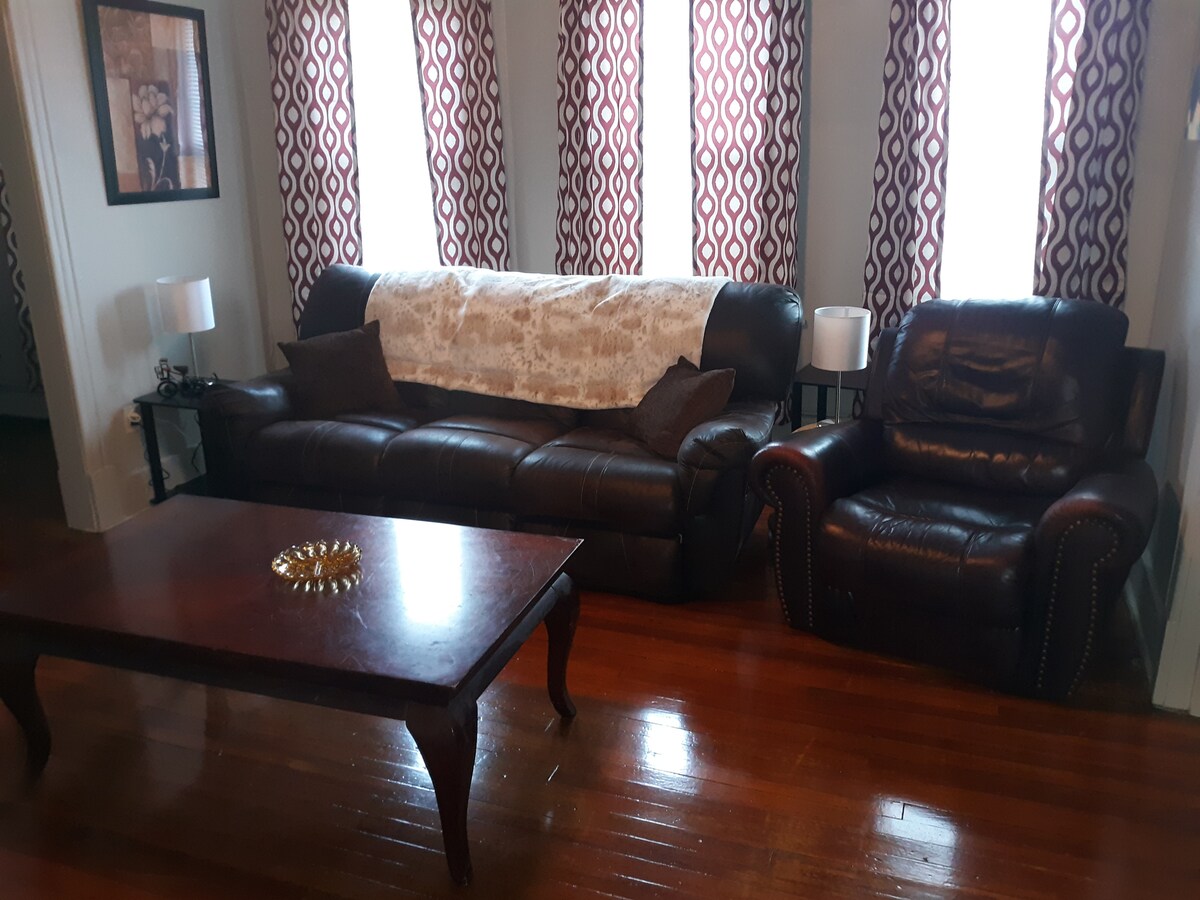Downtown restaurants and theaters. Great for a family or a couples get away. This apartment has a large eat in kitchen, large living room, 3 bedrooms. Queen beds in 2 of the bedrooms. Full size bed in smaller room. Beautiful hardwood floors through out. Enclosed front porch as well as small outside deck. Off street parking for at least 2 cars.