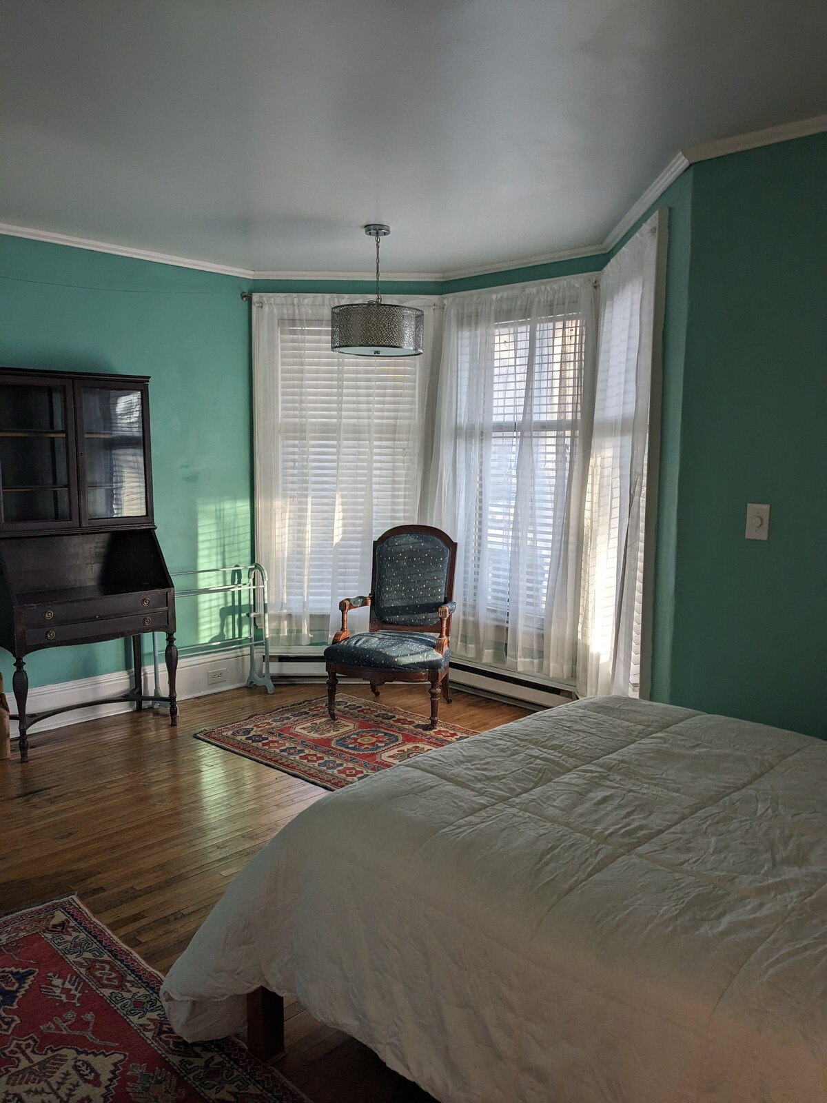 This sun-drenched, lovely one bedroom in a gorgeous old Victorian home has it all. Room for 4, with a full bed and comfortable full sized fold out couch, big windows with a bay in the bedroom, small, fully equipped kitchen, and bathroom with shower.