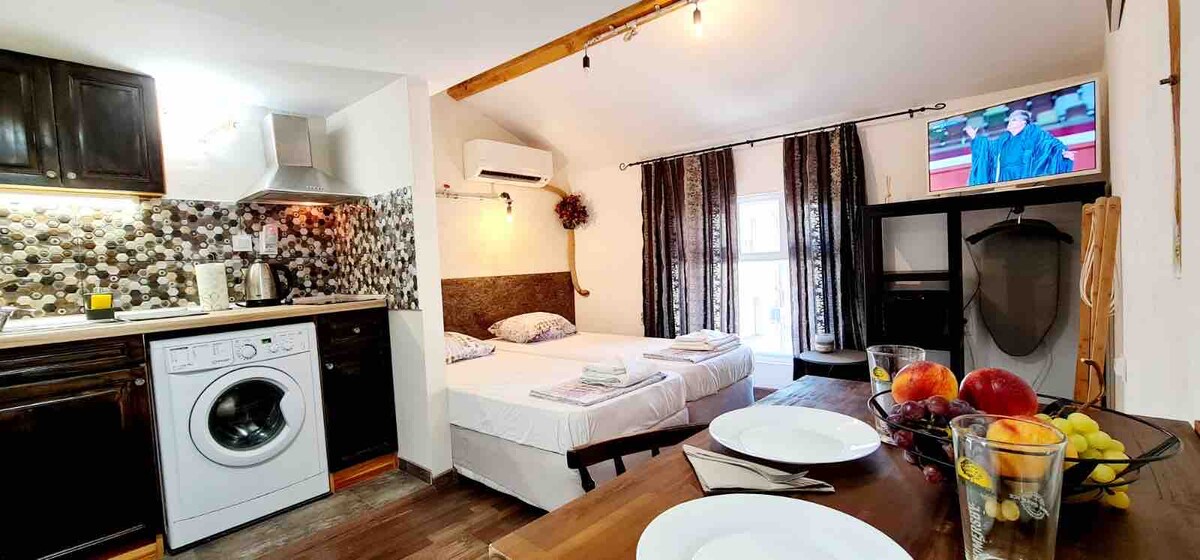 Newly renovated house with cozy studio. All with new appliances and furnitures. Decorated in warm colours with attention to every detail. The bed is big and comfortable, ideal for couples as well as solo travellers. A super fast WiFi internet connection is available. The kitchen is fully equipped with everything needed for a delicious home cooked dinner. Тhe TV has numerous channels if you feel like watching a movie or listening to music.