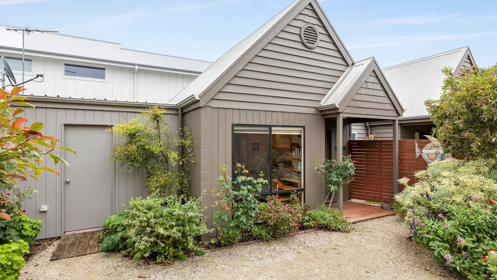Through sliding barn doors, accommodation options include two double rooms, a twin room with singles and a spacious master suite with ensuite and private north facing deck onto the garden, a perfect escape. There’s also a laundry with washer and dryer and garden access.