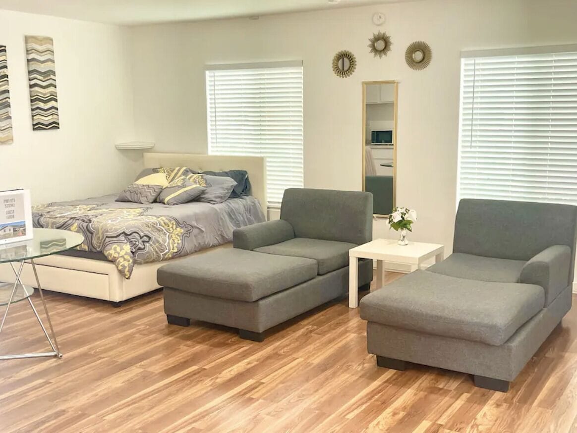 - "My husband and I really enjoyed our stay. There is plenty of space for up to 4 people with room to eat and relax. The room is as pictured. A few goodies and a well put together guide book were available. This garage conversion looks fairly new with some minor finishing touches remaining. We had no problem parking and felt safe in the cul-de-sac. Communication with the host was excellent. We would definitely stay here again if in the area visiting family."