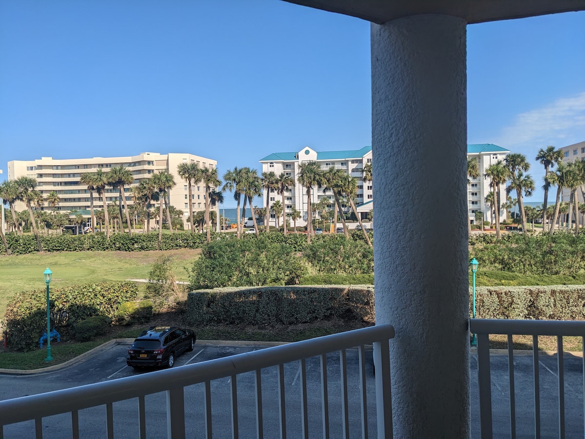 Take it easy at this unique and tranquil getaway. Direct Ocean front two bed two bath corner unit with unbeatable views from the Kitchen, family room and bedroom. The. Corner units offer the best views! Great sunrises along with occasional views of shrimp boats, manatees, turtle nest, rocket launches and even dolphins. Plenty of restaurants close by with one a short walk down the beach. Third floor with elevator, private access to no drive beach only a few feet away and a heated pool.