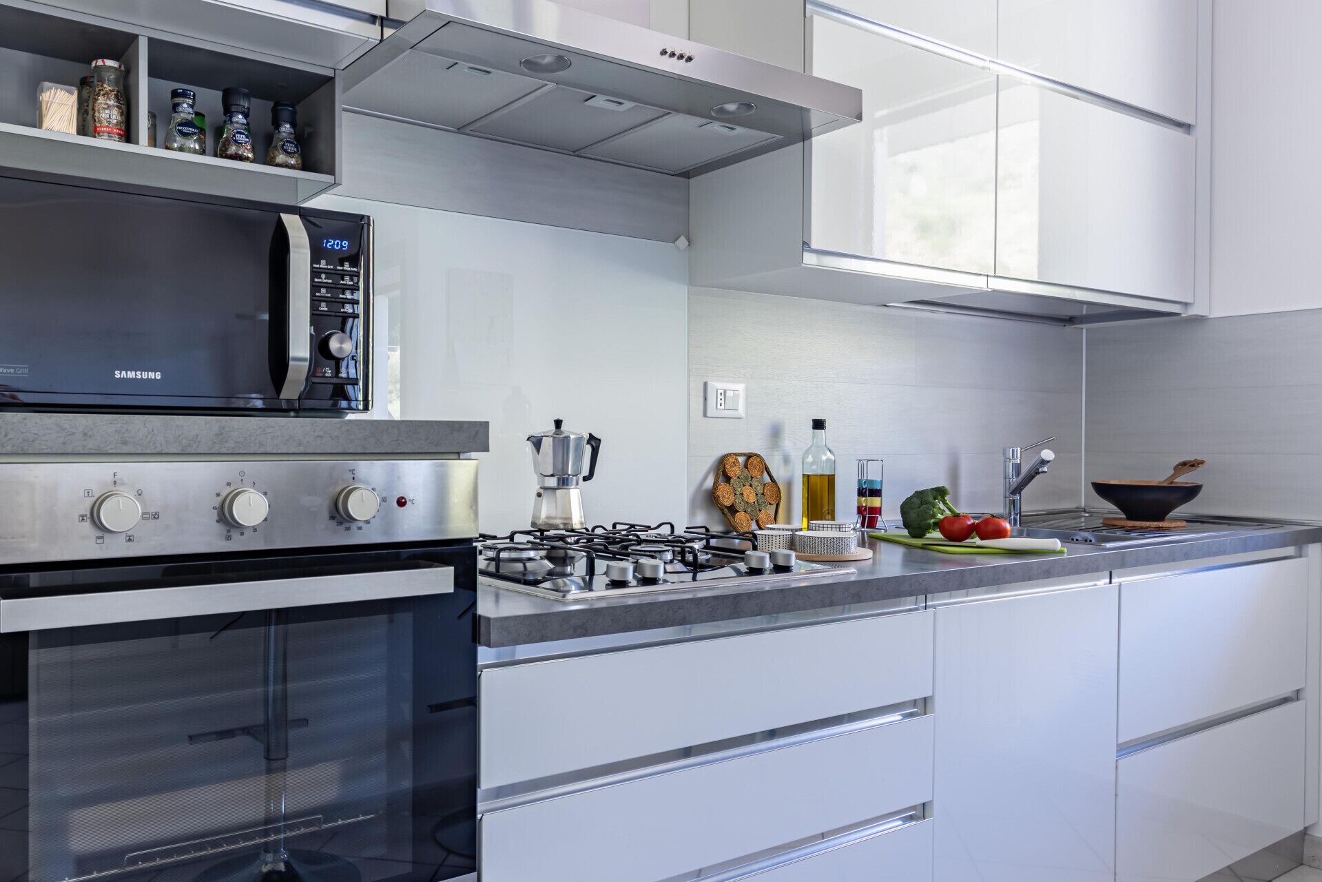 The kitchen is ready to face any culinary battle, armed with a fridge, induction cooktop and an extractor hood that pulls harder than a team of fans during a soccer match!