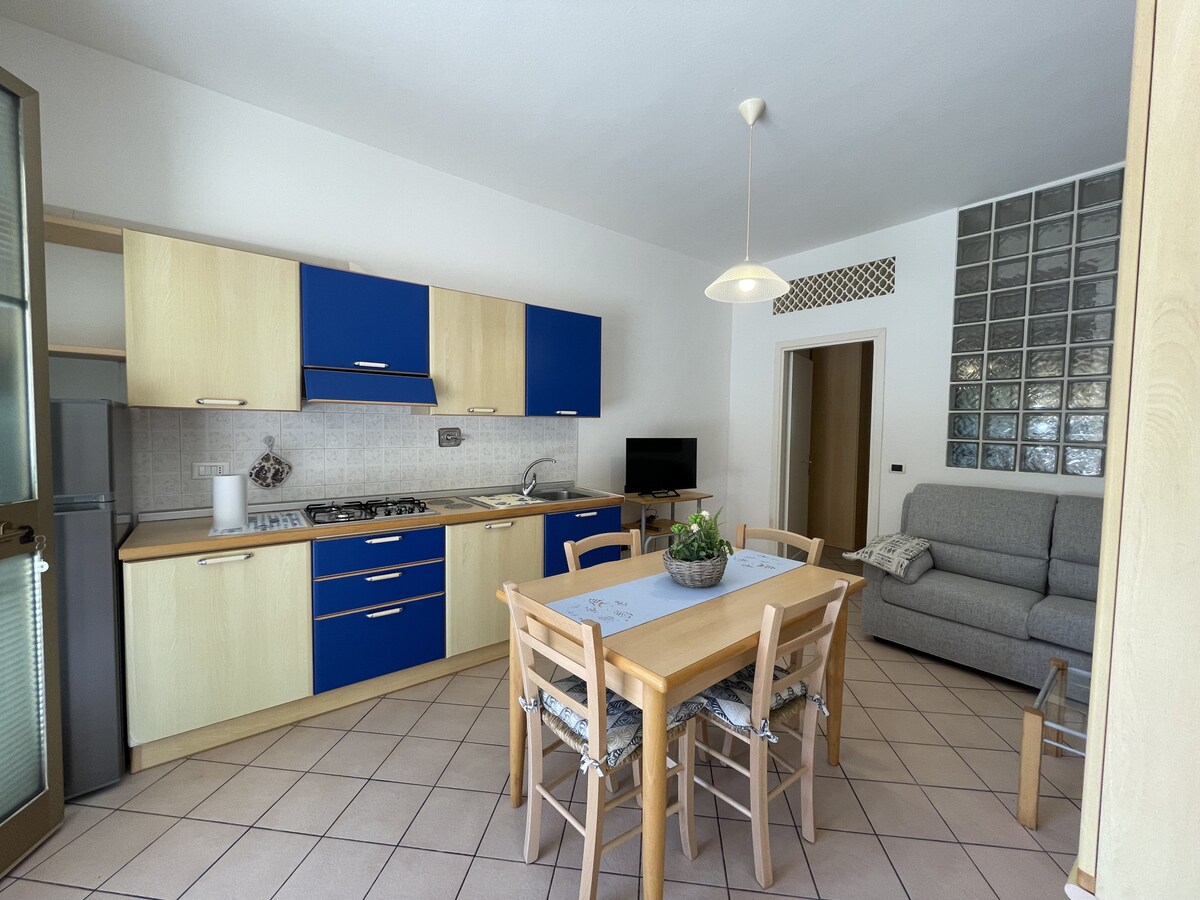 The two-room apartment is equipped with television, air conditioning, kitchenette, 4 beds, bathroom with shower and washing machine, terrace and reserved parking space.