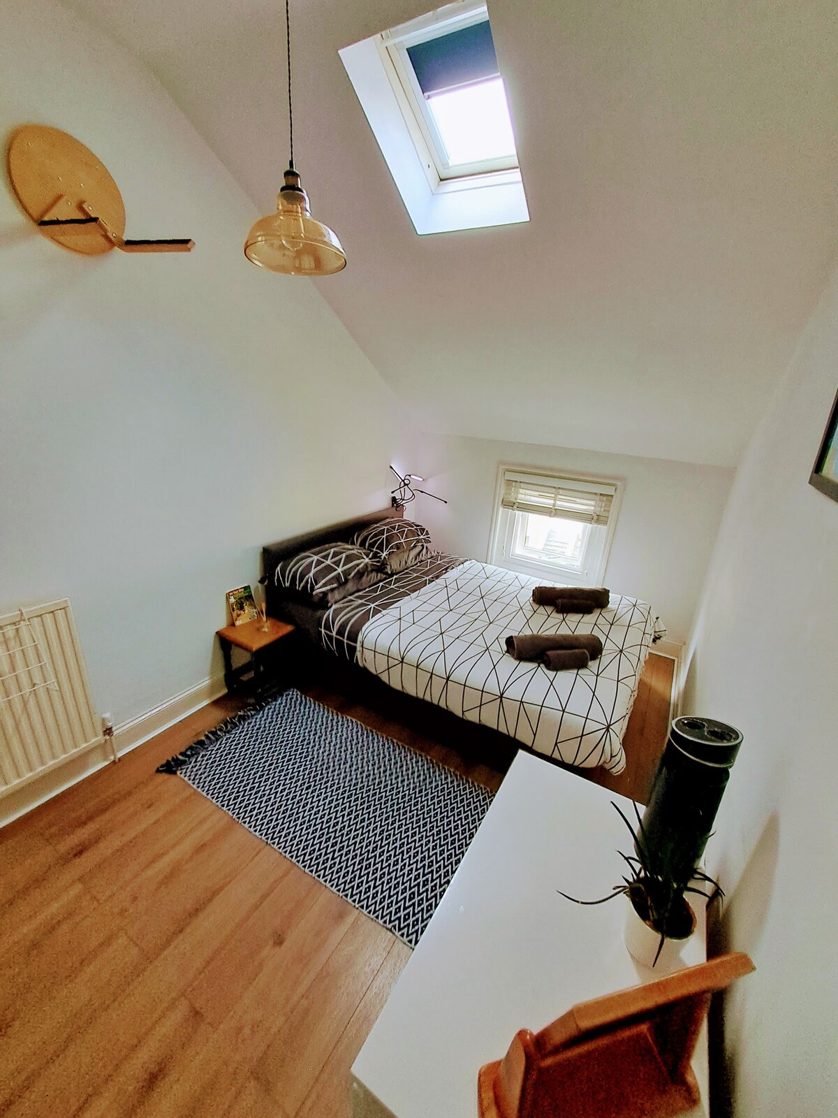 Private bedroom with shared bathroom in 3 bed and 1 bath loft conversion apartment that sleeps 2 is the perfect base for your stay in Southsea, Just a short walk to the newly redeveloped Southsea pier and Canoe lake, and then if you continue West along the seafront you'll reach the Spinnaker Tower and Gunwharf Quays.