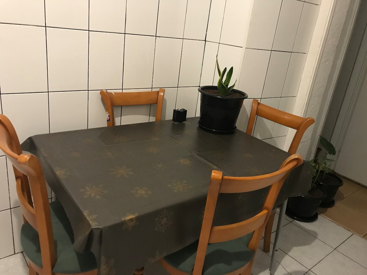 This is a private room in a 9-room flat. The flat has a fully equipped kitchen and two shared bathrooms.