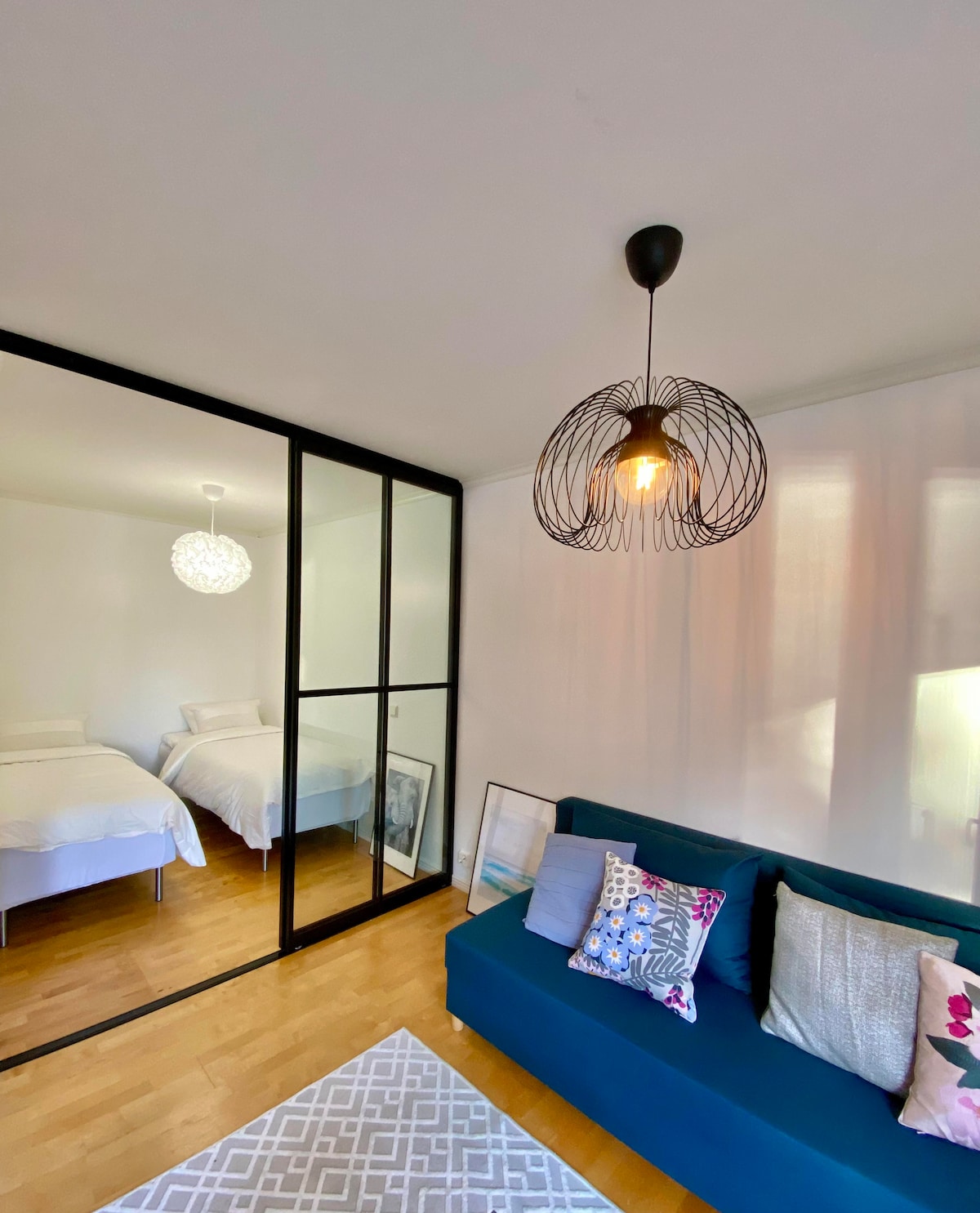 Dreamy bedroom with comfortable queen size double bed. The sofa in the living room can turn into two beds.
