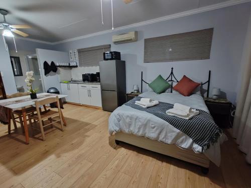 Large modern air-conditioned studio in quiet and safe neighbourhood. Studio on the first floor. Free WiFi, comfortable seating area with DSTV. Fully equipped kitchenette with honesty bar. Free parking behind locked gate.