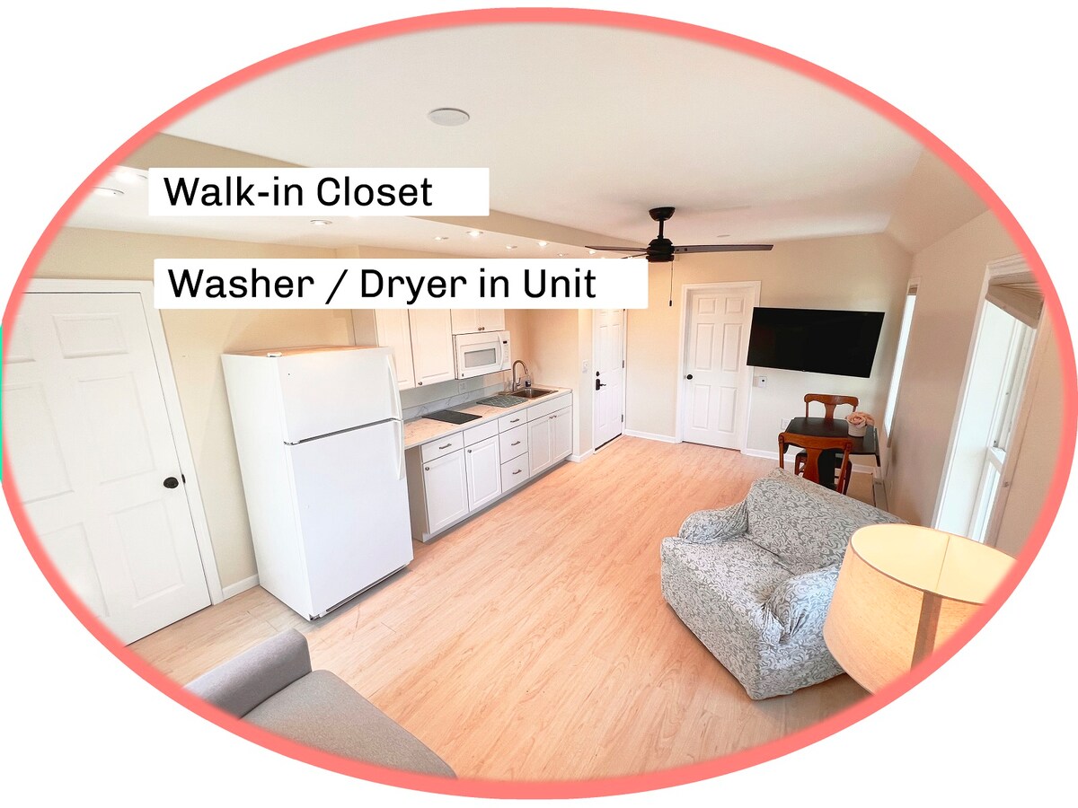 1-bed, 1-bath rental unit with fully equipped kitchen, washer/dryer, and private & free parking.