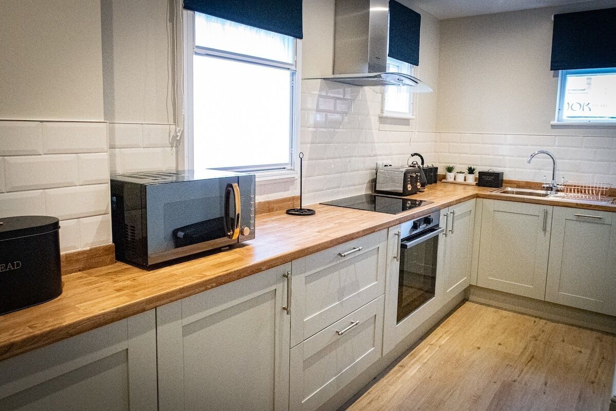 2. Fully-equipped fitted KITCHEN with oven, ceramic hob, microwave, fridge-freezer, toaster, kettle, coffee maker, and washing machine