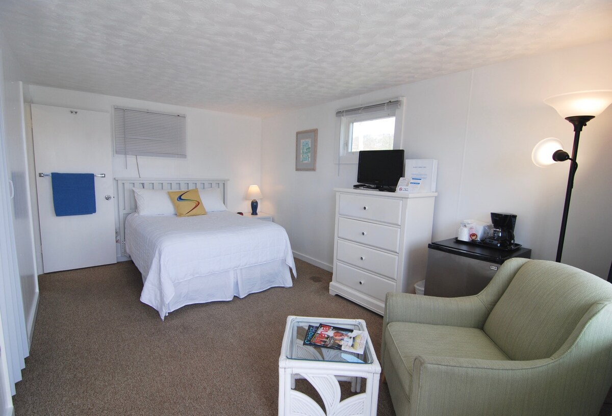 This private 147 sq ft room has a double bed & small bathroom with shower/toilet. It has its own entrance, mini fridge, free parking plus air conditioning but no heat. It's part of a beachfront resort with direct access to the beach from the grounds plus free access to heated indoor pool, outdoor pool, and tennis. Wi-Fi is not guaranteed, we have Ethernet connections for your use in the main building. Must be 21 to book. Sorry, no pets. Maximum of 2 guests, including children and infants.