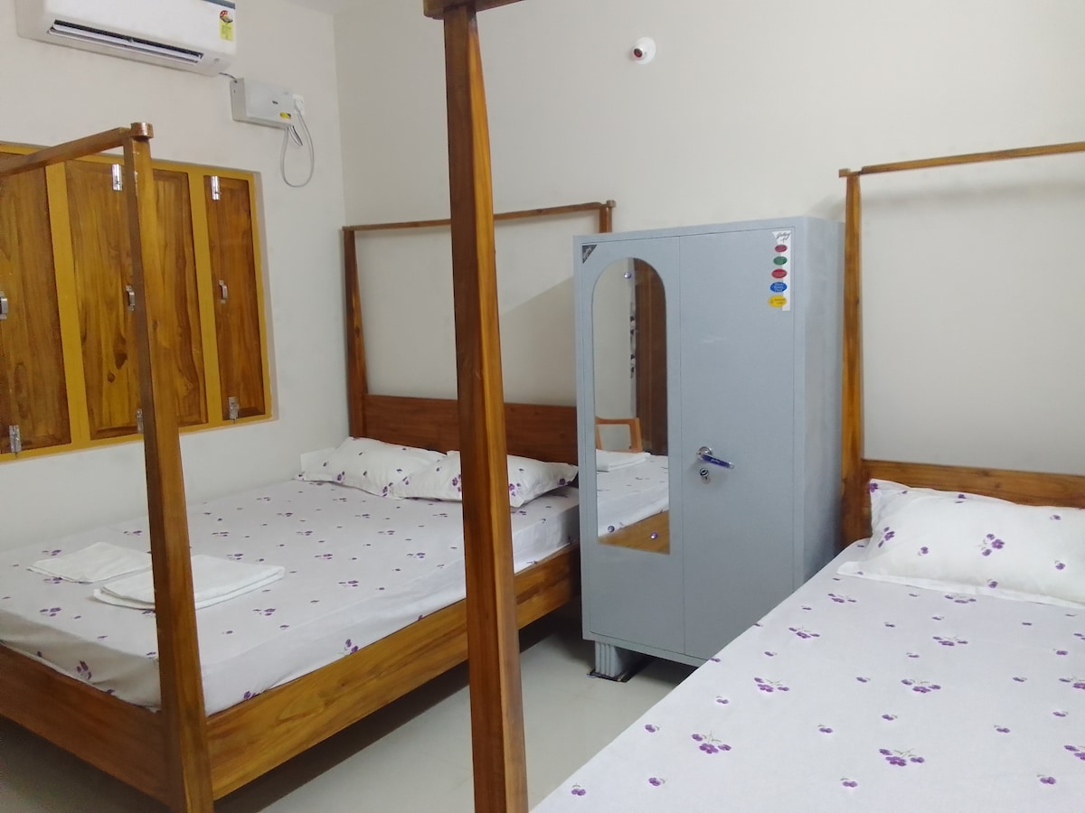 It's in the Mid of Jagannath temple and Sea beach. Its in the 1st floor with car paking facility. The room is provided with queen size bed and balcony with kitchen equipments.. The room is comfortable for four persons with two floor mattress. Home cooked food is available at paid charges. RO drinking water is available with self service. Two wheeler on rent available here with prior intimation.