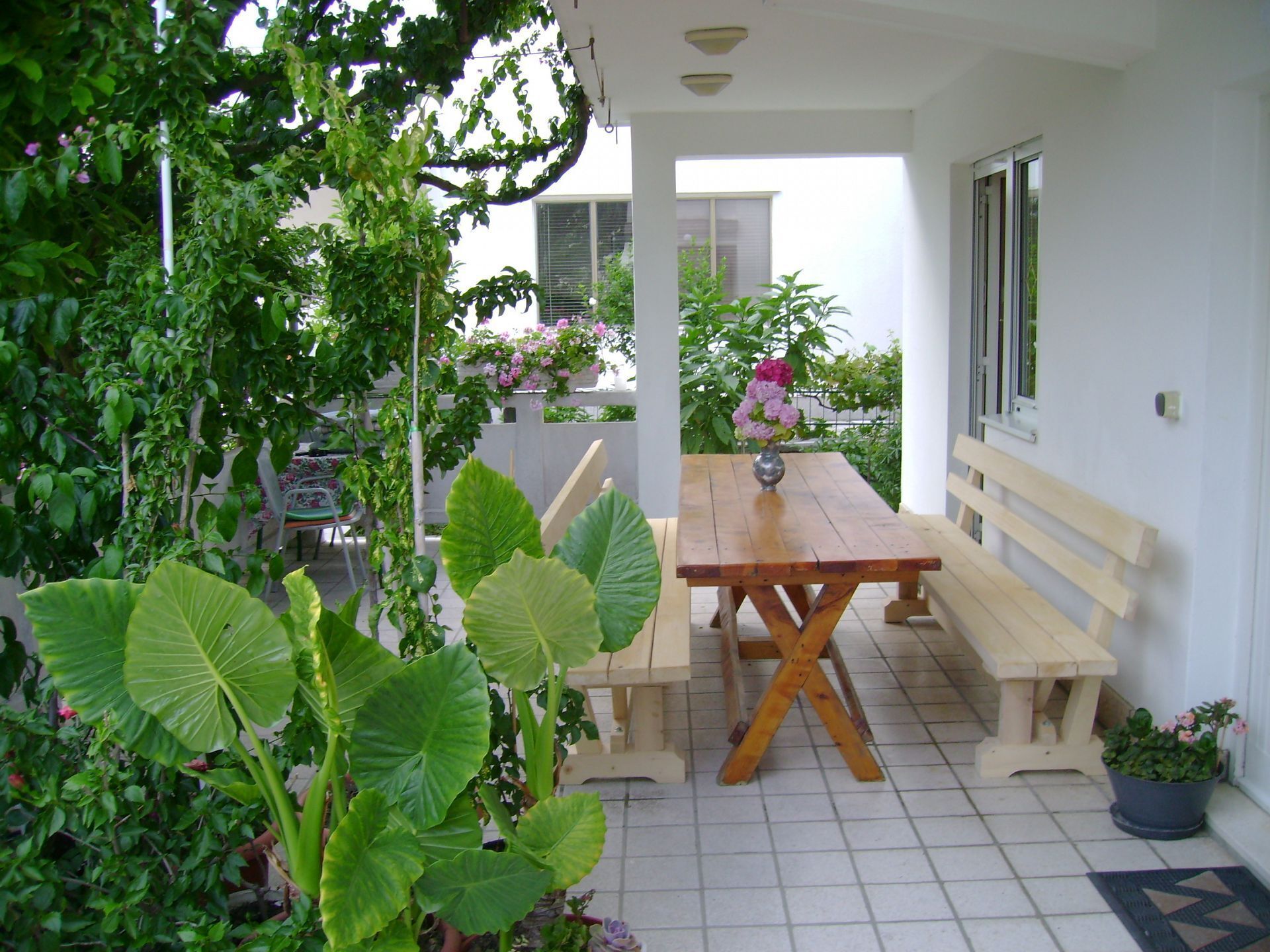 Our apartment is spacious, situated on two floors. There are two balconies accessible from the bedrooms and a big terrace on the ground floor, which is surrounded by green vegetation and offers plenty of privacy. A special bonus are two separate bathrooms with a shower.