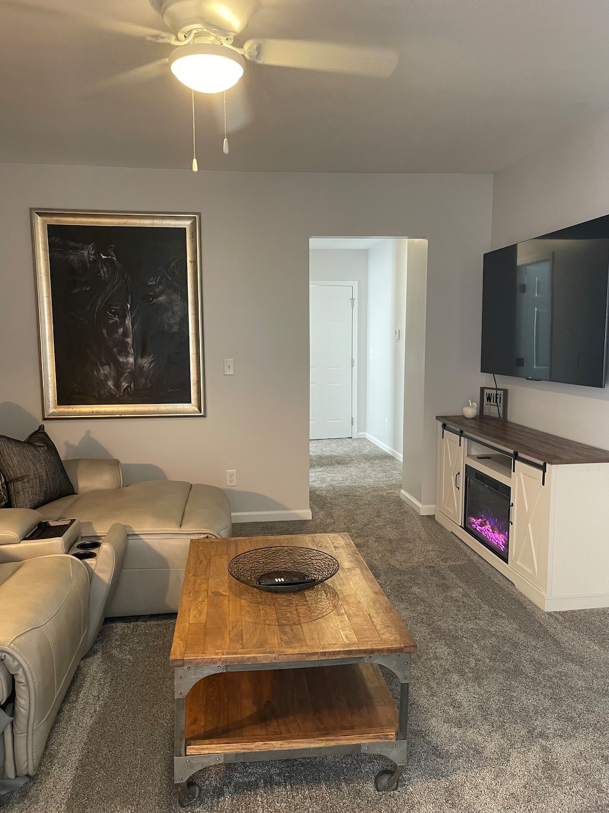 INDOOR LIVING: Smart TV, fireplace, board games, massage chair, dining table, work desk, monitor, printer, dry bar