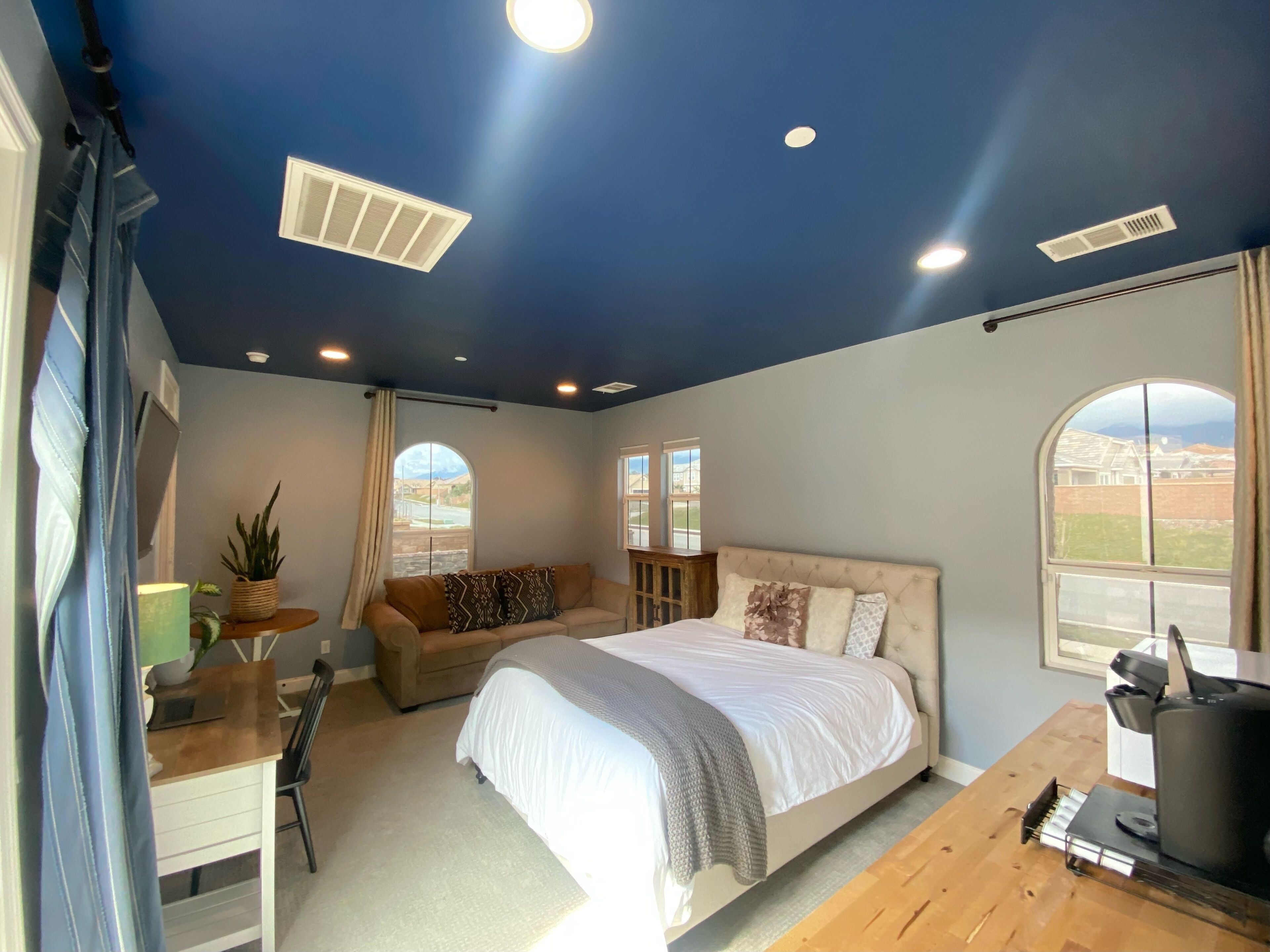 Located on cul de sac, fully furnished 420sq ft private modern studio in a clean, quiet north Rancho Cucamonga neighborhood close to Victoria Gardens. Appliances include refrigerator, stove, oven, microwave, toaster, Nespresso coffee maker and washer/dryer. Also included: comfortable king size motorized adjustable bed with USB ports and LED lighting, couch, wall mounted 75" Sony smart TV, 4K Apple TV, LED full color changing Wi-Fi lighting throughout studio, large oversized ceiling fan and independent climate control. Acccess to a shared beautiful tropical backyard with pool, spa, sauna and bbq. Internet access. Studio shares wall with main house and has private entrance.