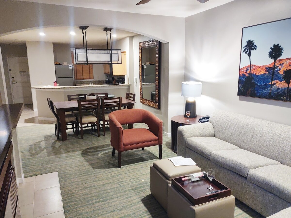 - "We really enjoyed our stay on this beautiful property that has close access to the freeway and is not too far away from the Empire Polo Grounds (about 30 min on street). The check-in process was very busy, but friendly and professional. The property is HUGE with multiple pools, amenities, and activities. Very clean and safe place to stay. The only issue which appears to be the property's issue is the layout map of the room which shows two queen beds, however my room was a king bed and very comfortable sofa bed) rather. Richard was quick to inform me of the issue and asked if I wanted to continue my stay. Would definitely stay again and bring family, lots of fun for children. "