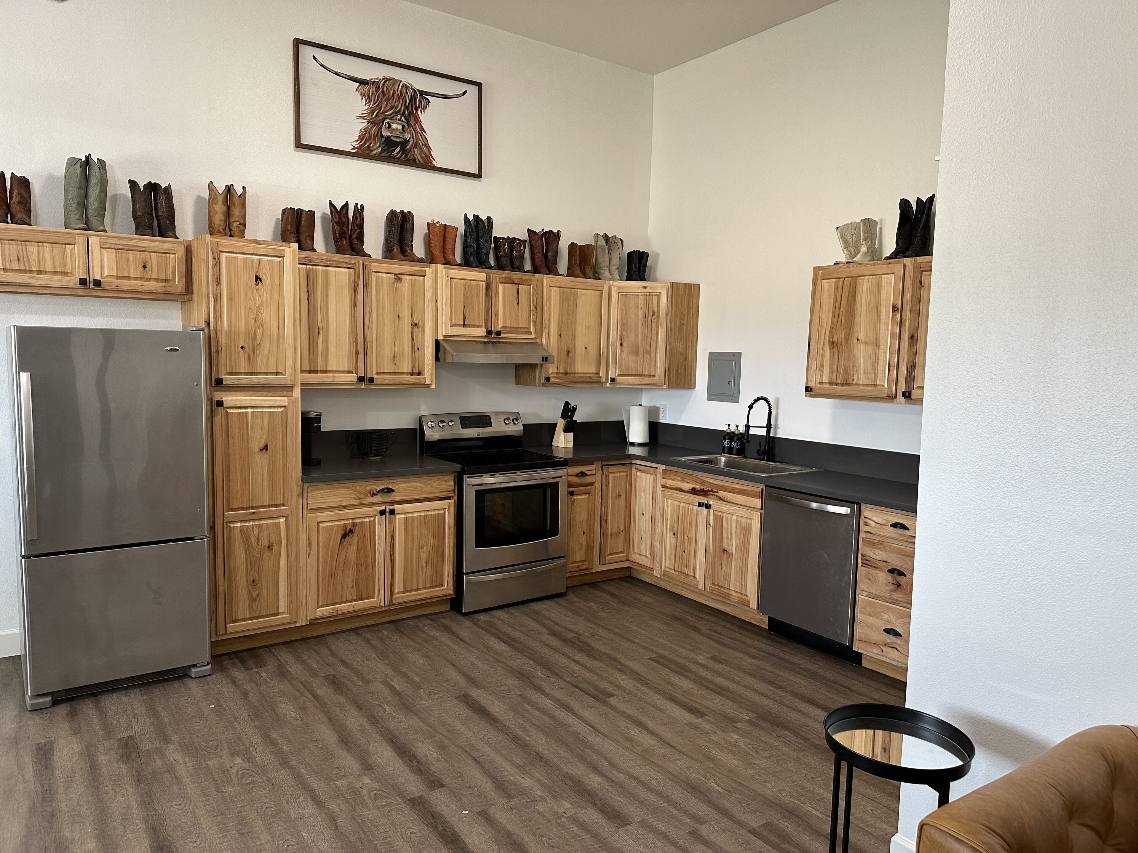 The hallway leads to a bedroom on the right with a queen bed with a gorgeous upholstered gray velvet tufted headboard with nail head trim, super soft comforter set, a new luxury hybrid mattress, mirrored dresser with round bling mirror, cute black nightstands and white distressed vanity desk with fluffy white stool. Continue down the cowboy decorated hallway to the narrow bathroom on the right with vanity sink and toilet, bathtub, and shower. At the end of the hallway is the kitchen decorated in a farmhouse theme with full sized refrigerator and freezer, counter height dining table with 3 stools, stove/oven, sink with new faucet, and counter and cabinet shelving. New stainless steel convection microwave, Keirig coffee maker, blender, rice cooker, and more. Board games, books, and toys are included to give you a relaxing and enjoyable stay.
