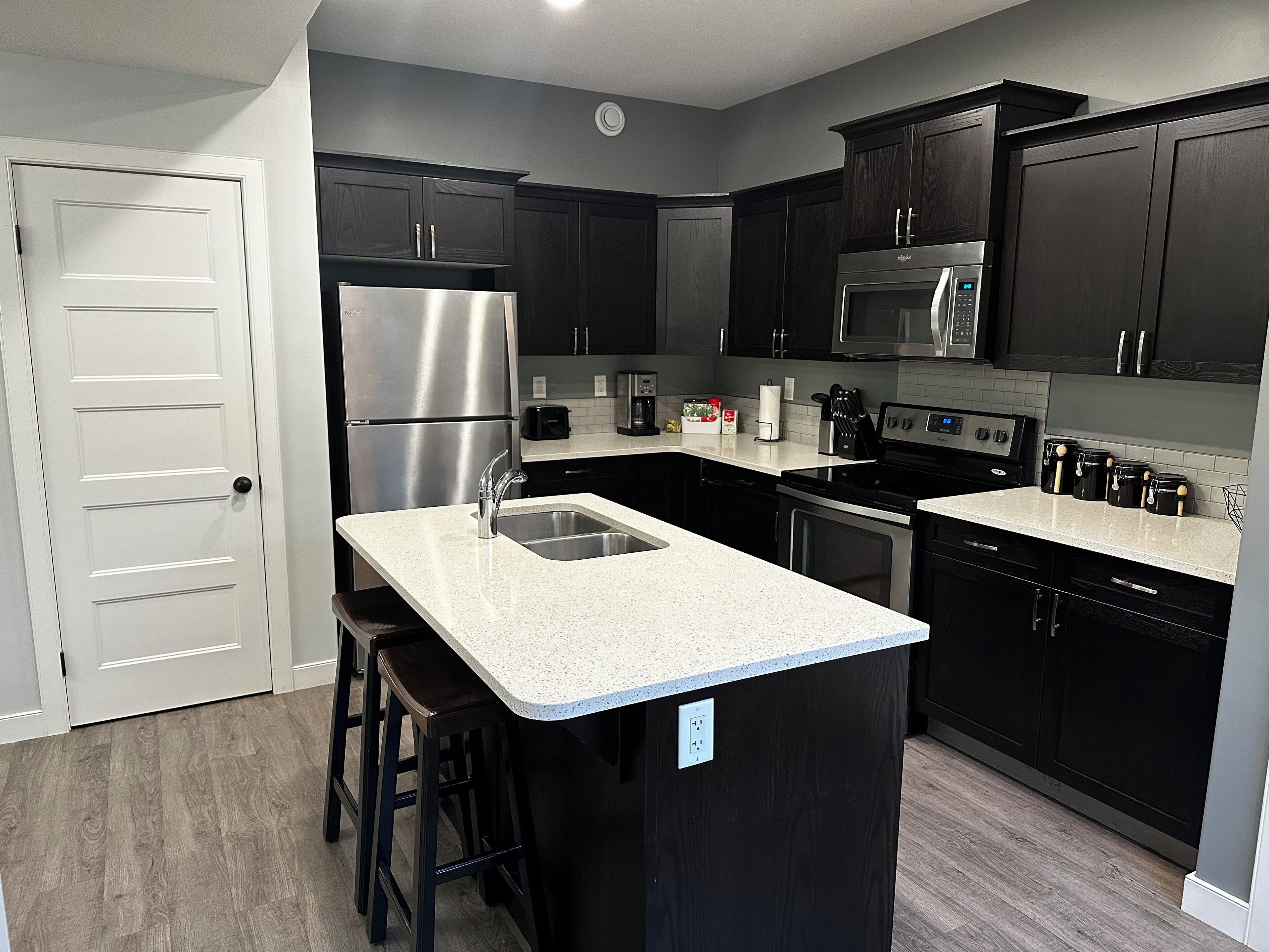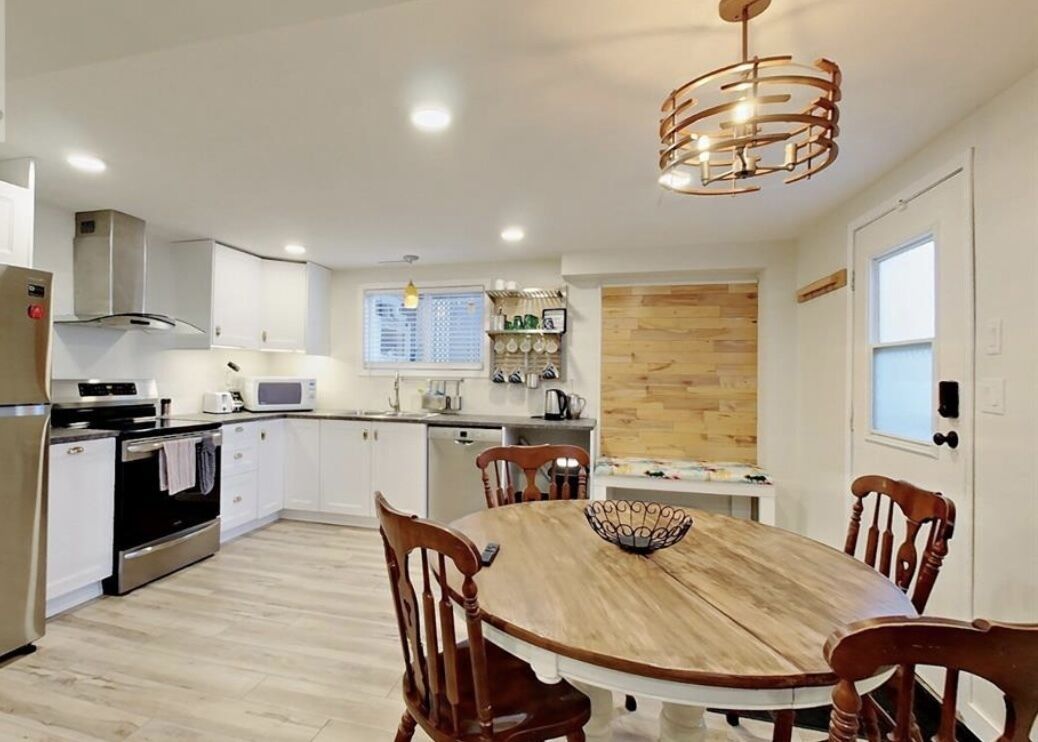 Brand new feel! Renovated suite. Quartz kitchen, fully stocked, island, laundry. Spacious master w/walk-in. Smart TVs in all rooms. Tiled shower, modern bath. Double off-street parking. Blocks from main avenue. Open concept living/dining. Perfect for families/groups. Enjoy a bright, airy space. Cook, relax, socialize. Convenient location near shops, restaurants. Modern comfort, easy access. Ideal for short/long stays. Home away from home!