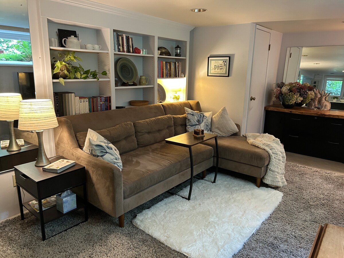 All utilities & wireless internet included. Located on Lake Sammamish, bike and walking trails are at your door, or simply relax to the view of the lake. Minutes from Grocery/Deli, Coffee, Restaurants, Shopping and Entertainment. On the bus line. Fully equipped kitchen with dishwasher, built in microwave, plug in cooktop, coffeemaker, dishes, cookware, Washer/Dryer in unit, HD-Smart TV. Queen bed, Access to the shared yard including Hot tub, Lake Sammamish, dock, beach, canoe, kayak, paddleboard, snorkeling equipment, swimming. (No lifeguards), Barbecue grill. Picnic tables