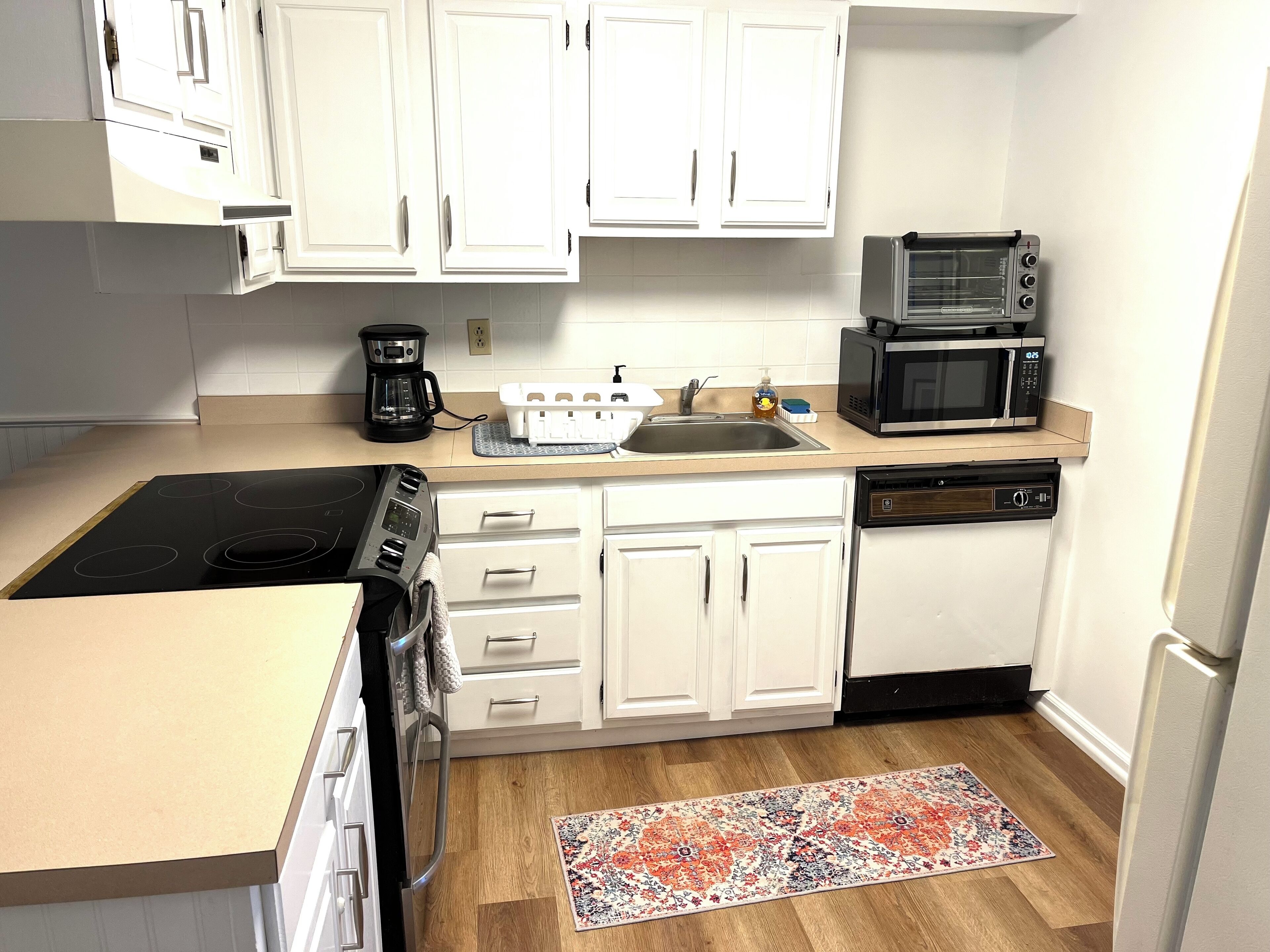 The kitchen has dishwasher, microwave, refrigerator w/ice maker, electric stove and small air fryer. Washer/Dryer is included as well for your convenience. We also have a Keurig coffee with complimentary coffee pods. (Individual Sweetener and Creamer included).