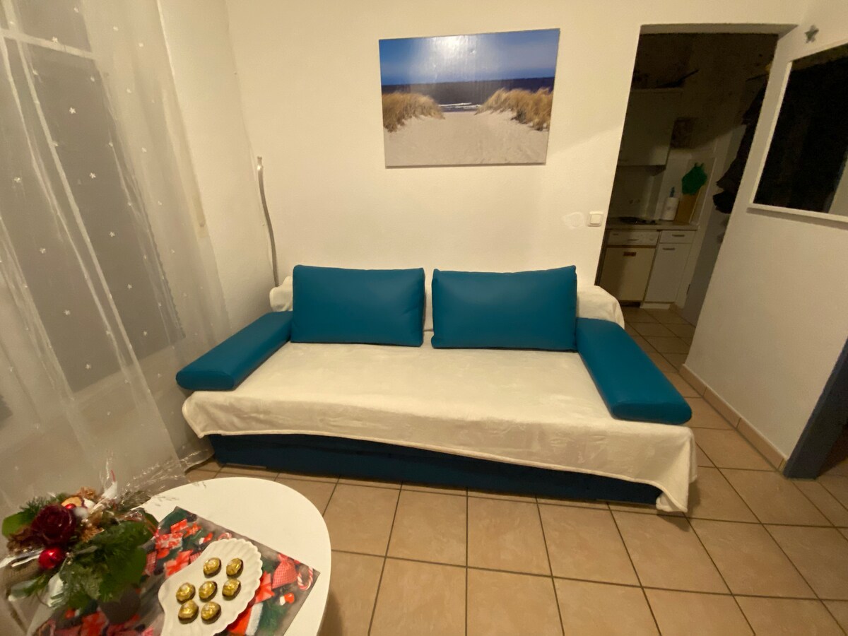 The 1-room apartment is ideal for 1-2 people. The combined living/ dining room is equipped with a bed measuring 1.60x2.00m . Opposite the bed is a small dining area and a flat-screen TV. The kitchen is equipped with a coffee machine, an electric kettle and a microwave with a grill and baking function. The dishwasher completes the decor. Wifi is available to our guests free of charge. A parking space does not belong to the apartment.