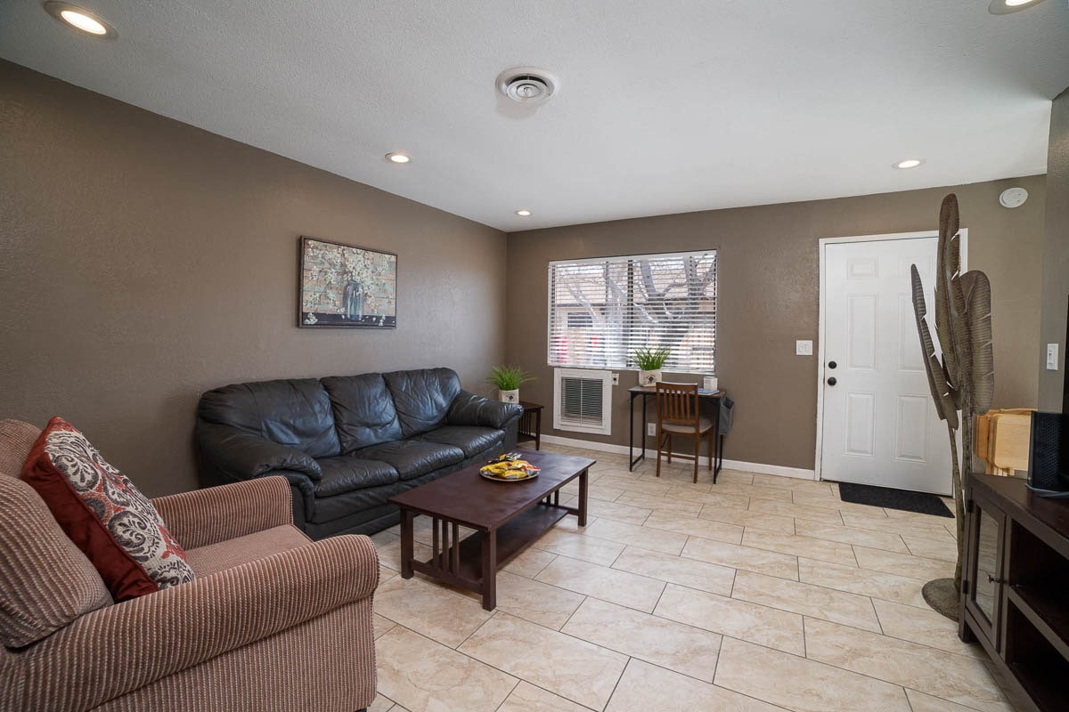 This space comes with a smart TV, full kitchen appliances and set. Queen size bed with coffee table, closet and drawer. Garage and patio included with the space. (sedan recommended)