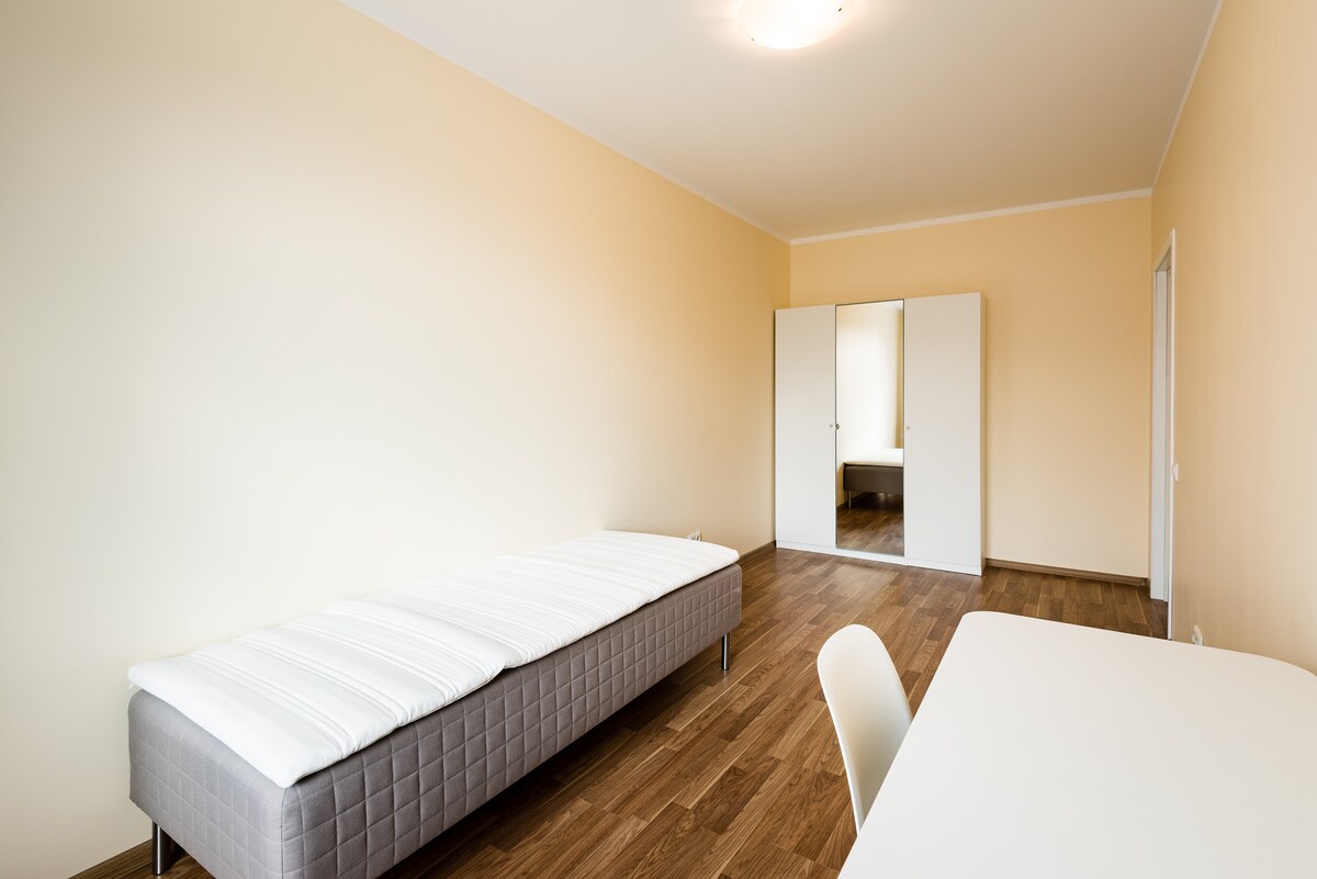 This recently renovated bright apartment has 6 bedrooms, a modern kitchen and 2 large bathrooms. The apartment has everything you need for a convenient stay starting from oven and microwave to water kettle and washing machine. This double bedroom has 2 single beds with comfortable mattresses, 2 study desks, 2 chairs and 2 wardrobes. Ready for you and your roommate to move in.