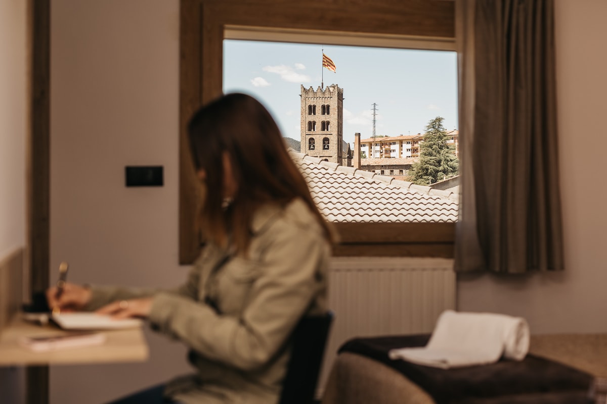 comfortable rooms with a double bed. They offer views of the monastery of Santa Maria de ripoll and the village. They have a full bathroom, hairdryer, desk, wifi, flat screen TV and parquet floor.