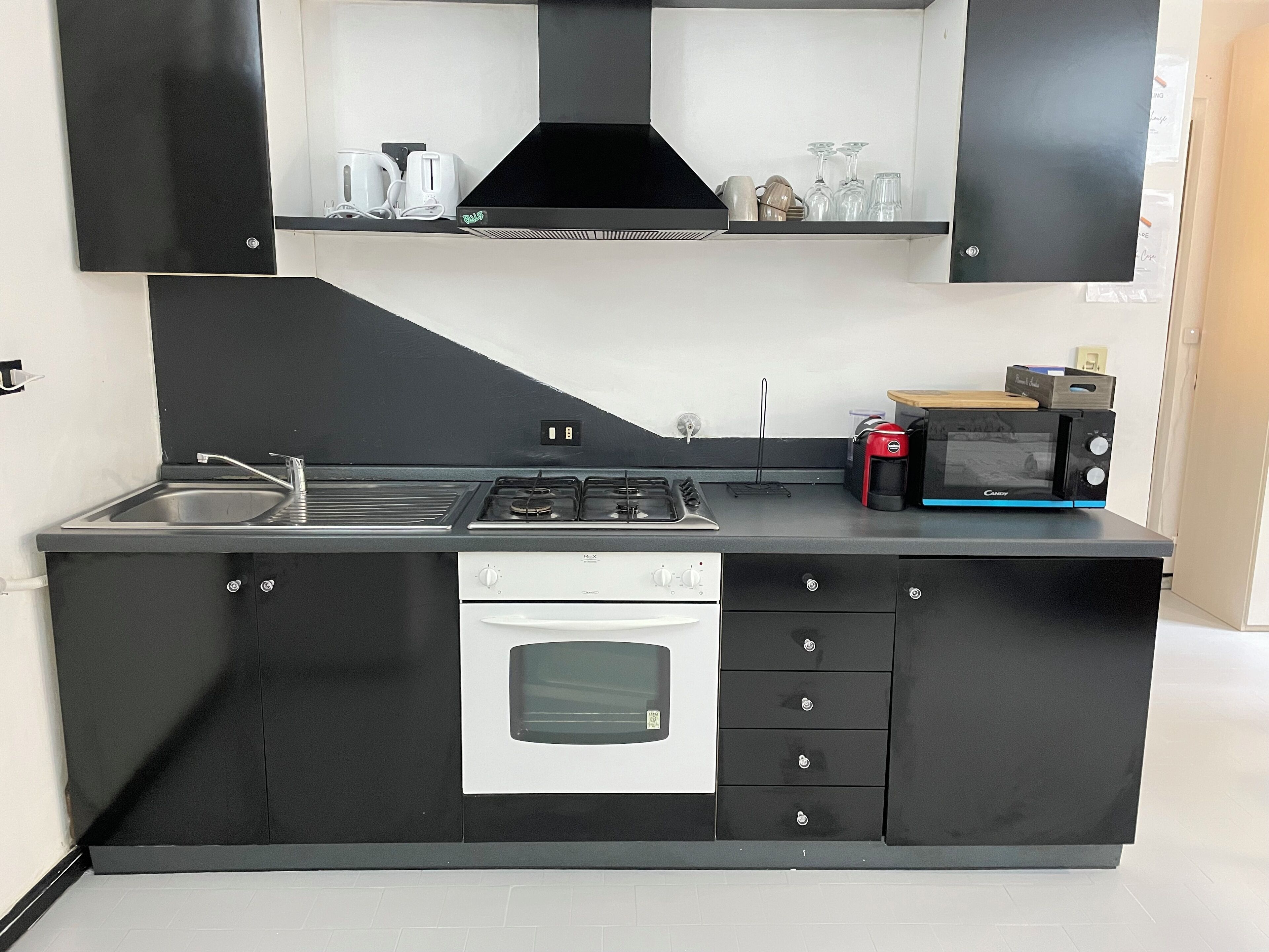 There is an espresso coffee machine with different flavors of pods, kettle, toaster, dishwasher, microwave, induction hob for wine cellar.