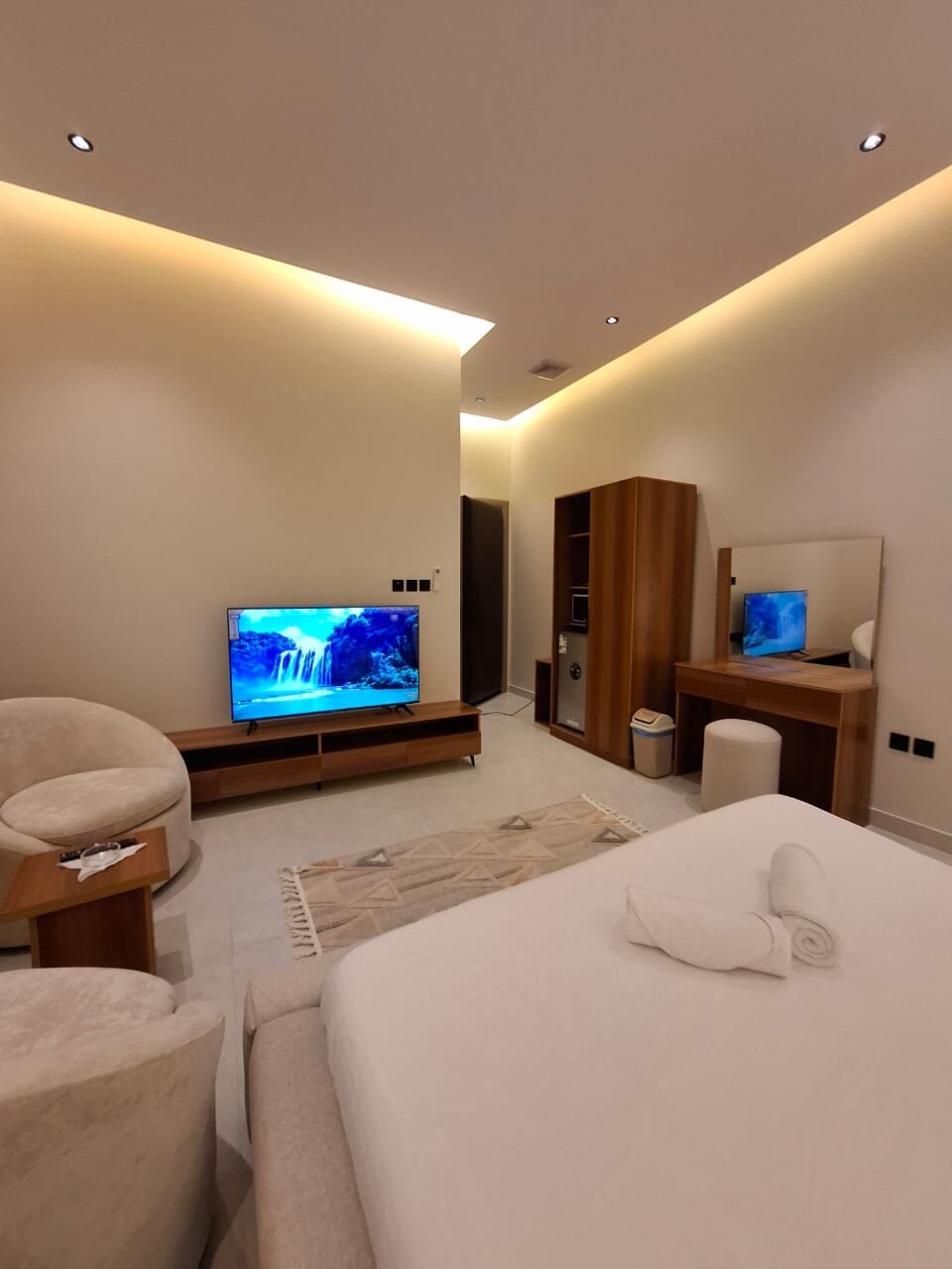 This studio is strategically located close to vital and leisure services and activities such as: 1-Wonder Winterland 2- Financial City (KAFD). 3. Digital City 4- Window on King Abdulaziz Road, Abu Bakr Al Siddiq Road and 6 North Ring Road - Near Boulevard City and Boulevard World Riyadh . This studio has all the needs of a bedroom, a bathroom and a storage area that provides all the needs of the toilets, as well as a mini fridge, a kettle, unlimited internet, a smart TV containing : stc tv, watch, YouTube and iptv