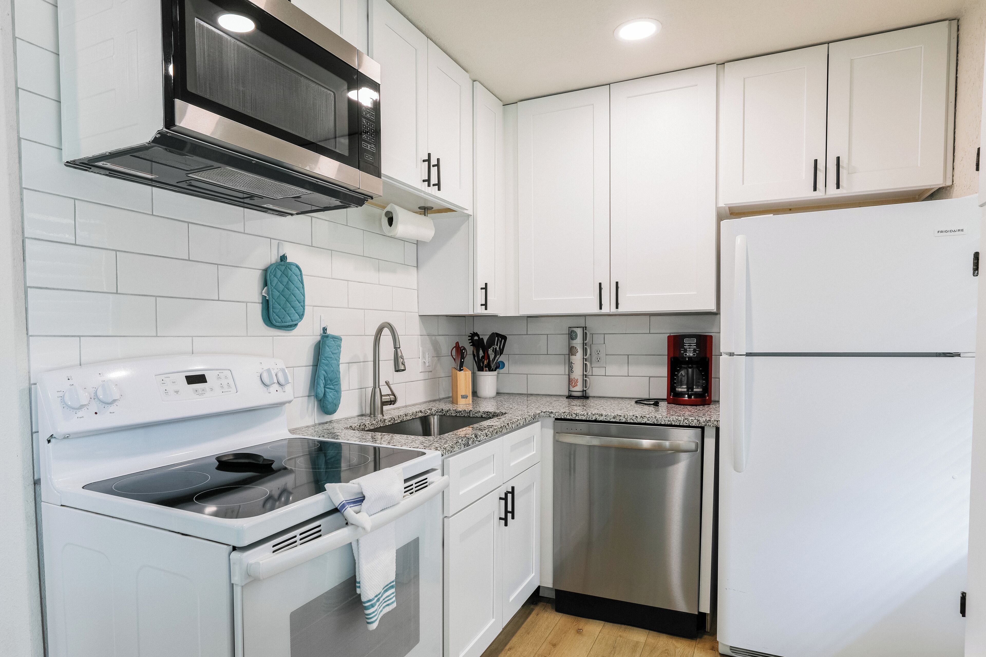 Blender, Coffeemaker, Cooking Utensils, Electric Stove, Ice Maker, Microwave, Oven, Toaster