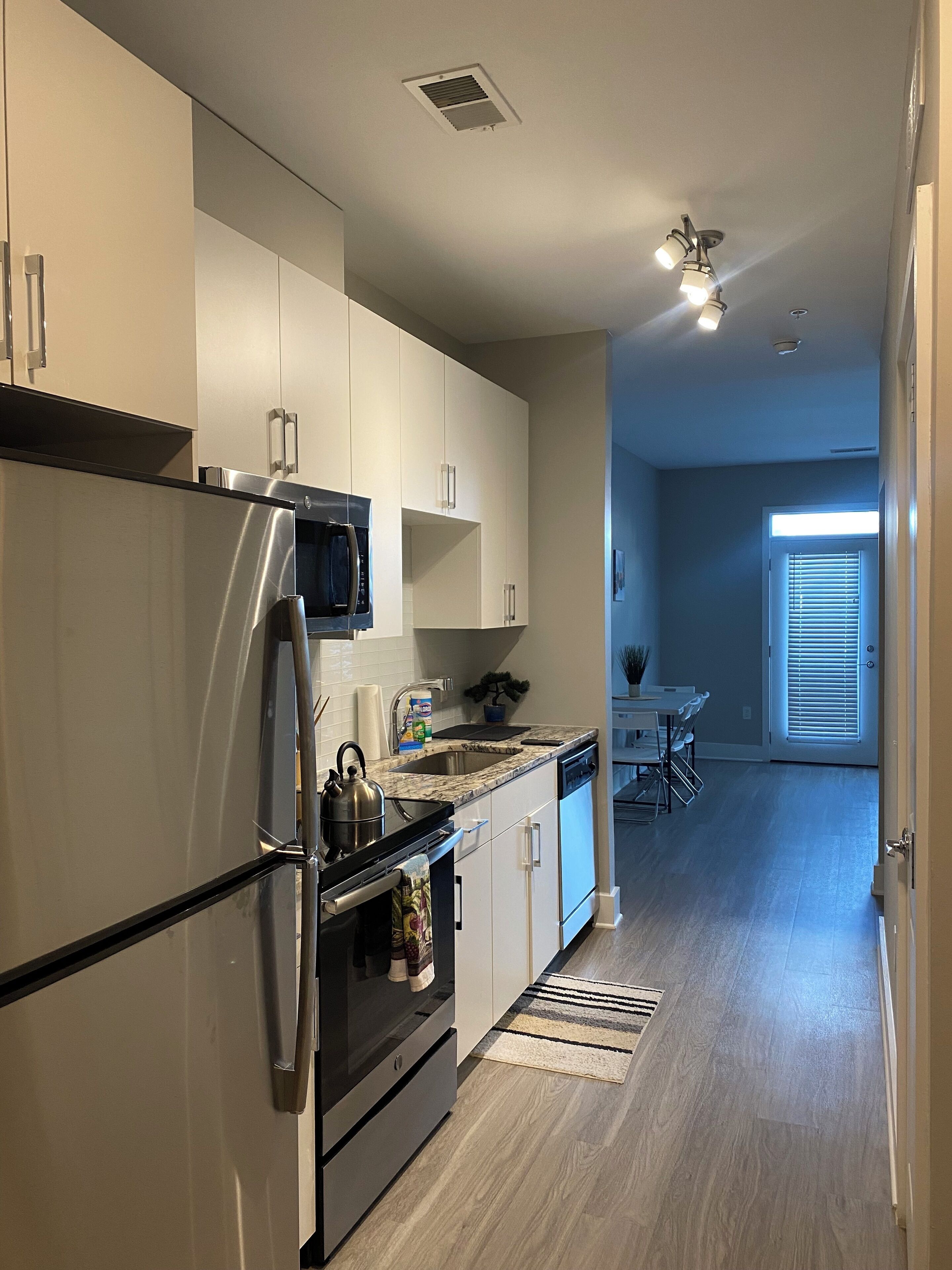 This spacious apt features smart TVs, Lamps with usb ports and clean comfortable sleeping spaces with plush bedding