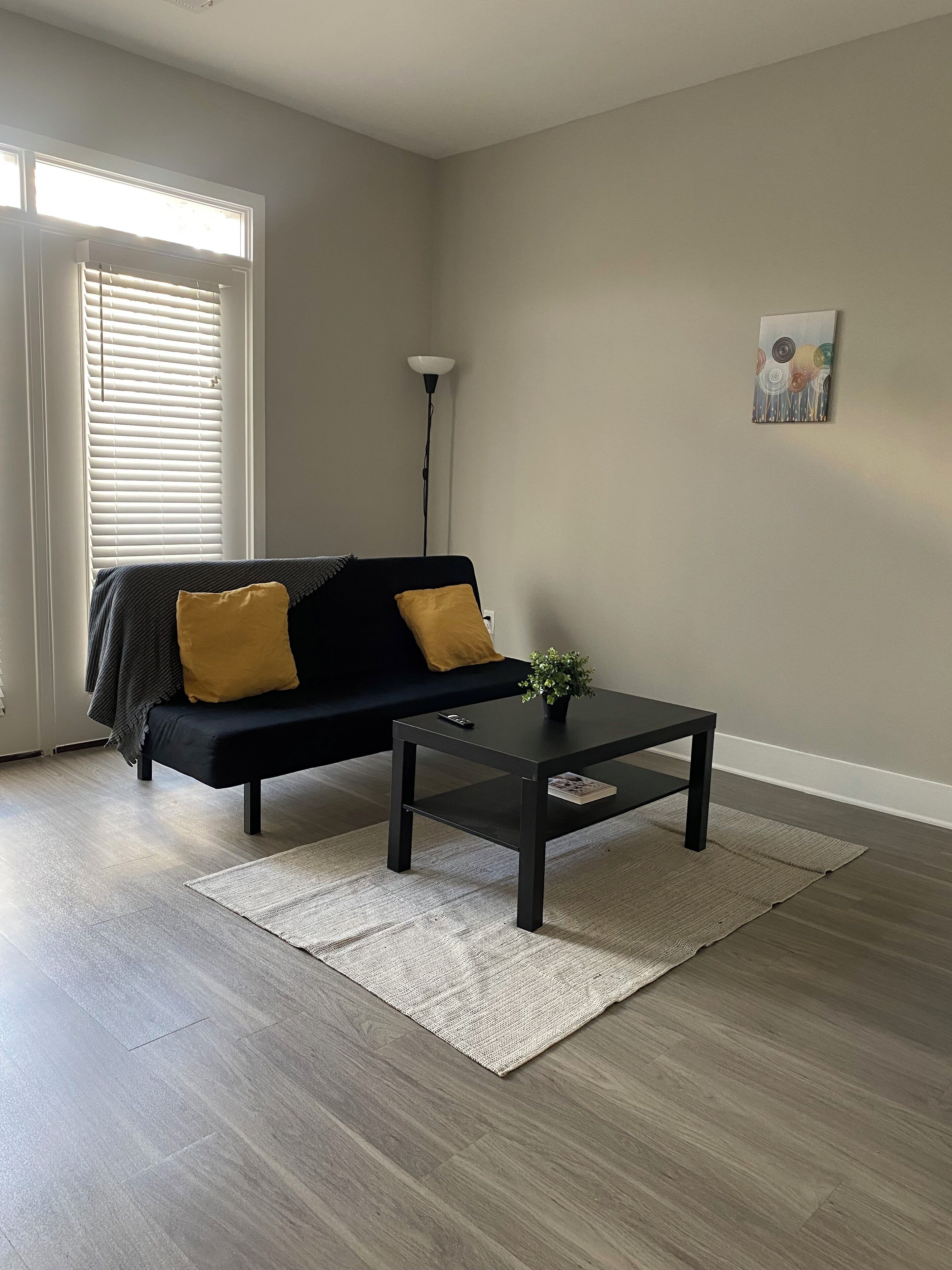Optimized Living Space: Large windows flood the space with natural light, enhancing the hardwood floors' clean, airy feel. The living area is thoughtfully furnished to cater to both relaxation and productivity, complete with darkening curtains for utmost privacy.