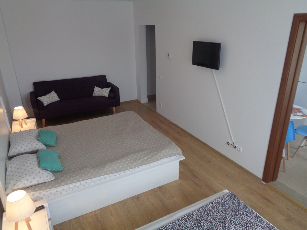 New studio apartment 2020 , at the exit of Brasov . Located on the ground floor with large open balcony and access to its own garden ( in the process of arranging ). Simple , spacious ,new and clean. 5 min drive from Mall Coresi and end of line Rulment.All facilities for a few days of relaxation.